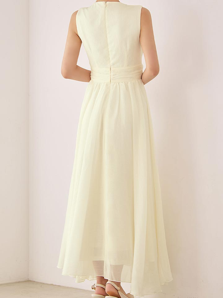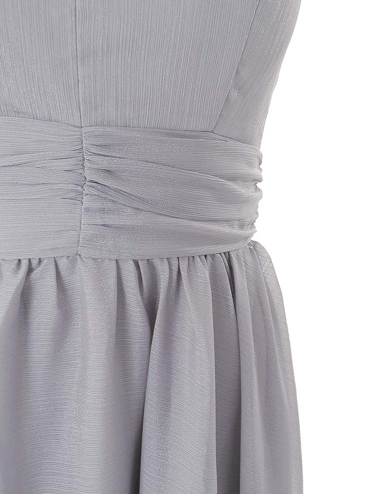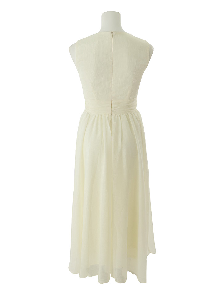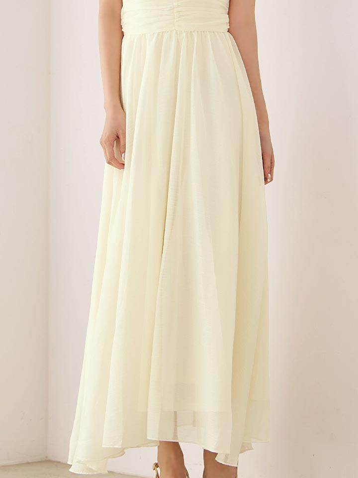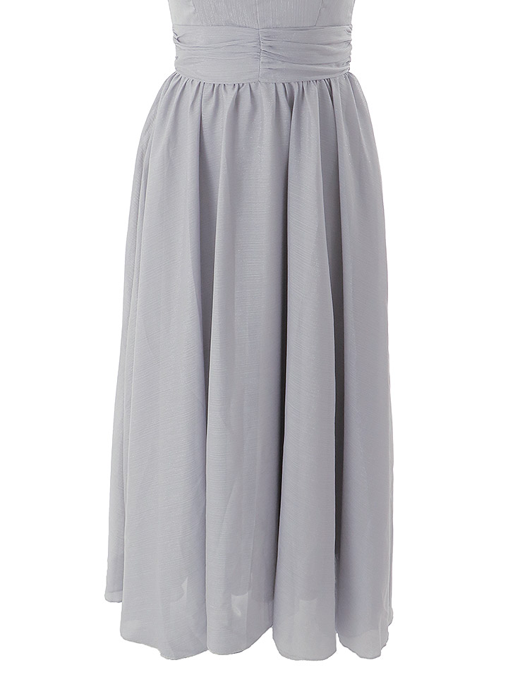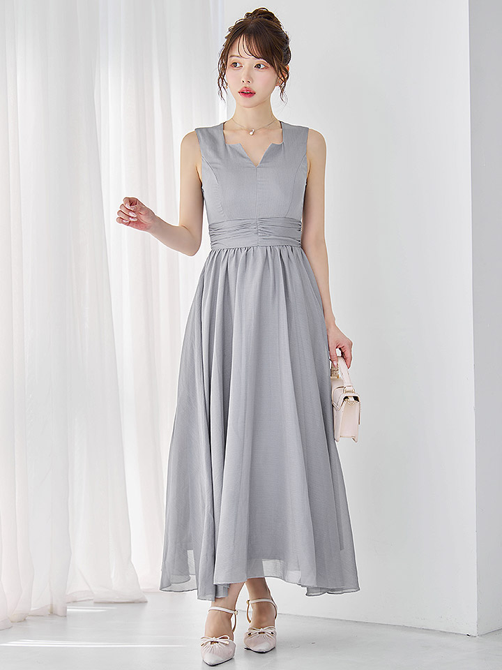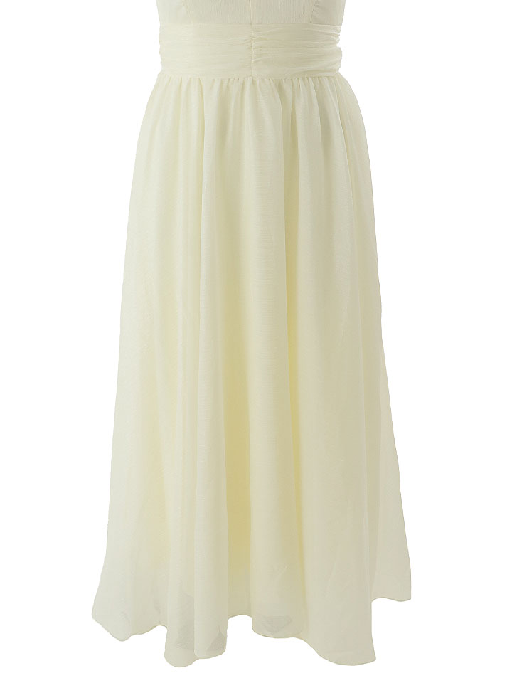 ふんわりと広がるシフォンのフレアスカートが軽やかに揺れるロングドレス。