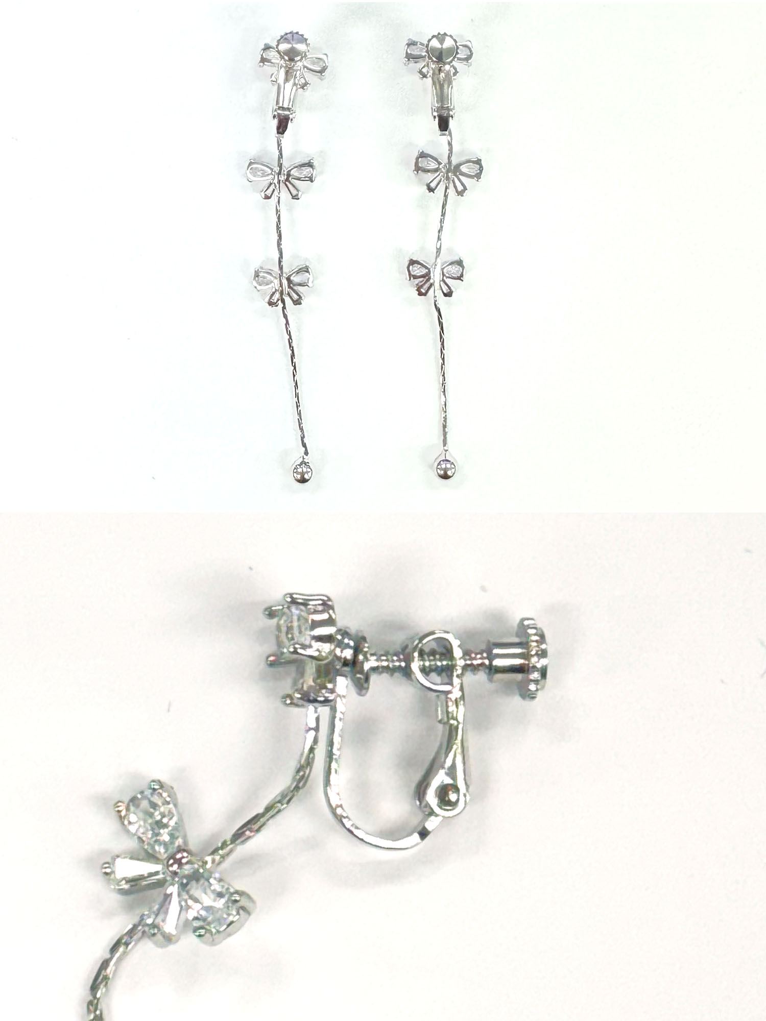 小さいリボンが揺れるデザインのイヤリング。