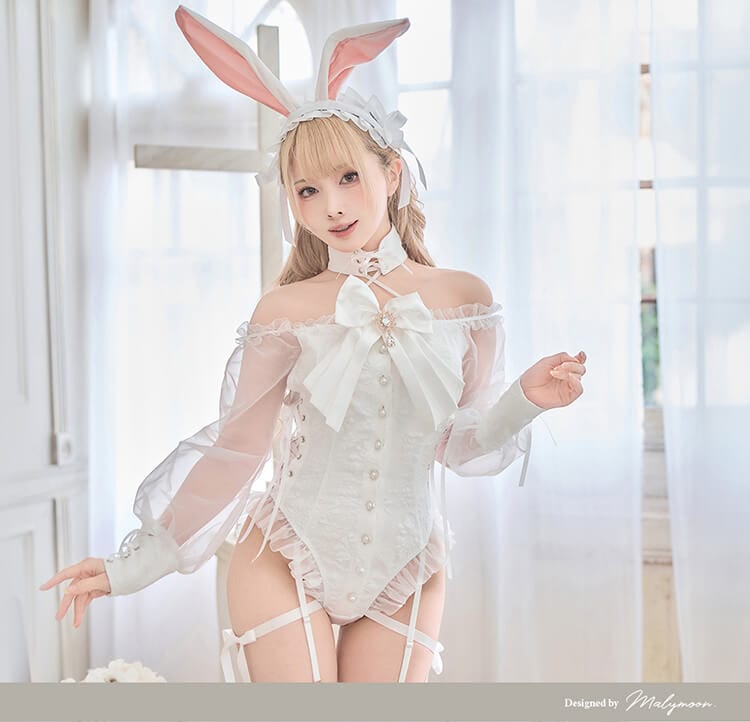 うさぎ バニー うさ耳 リボン 甘い あざと コンカフェ スイート あまい ハイレグ 長袖 ロングスリーブ オフショル オフショルダー レース フリル シアー シースルー チョーカー セクシー コスプレ ランジェリー 白 ホワイト