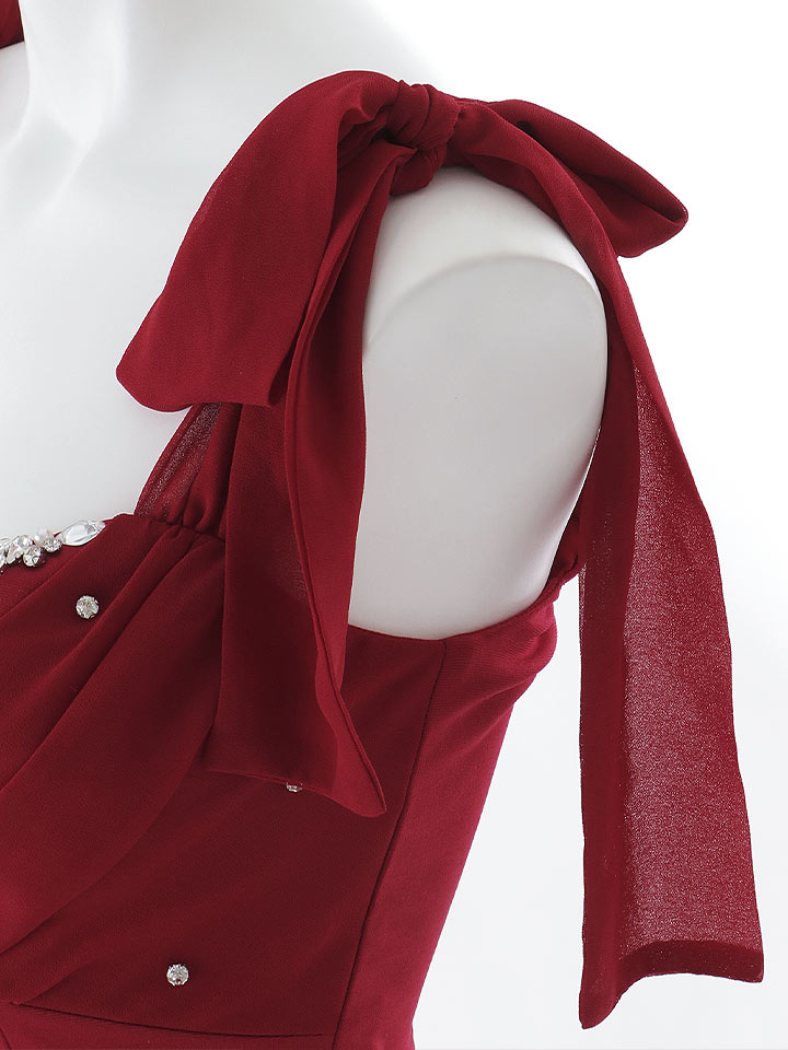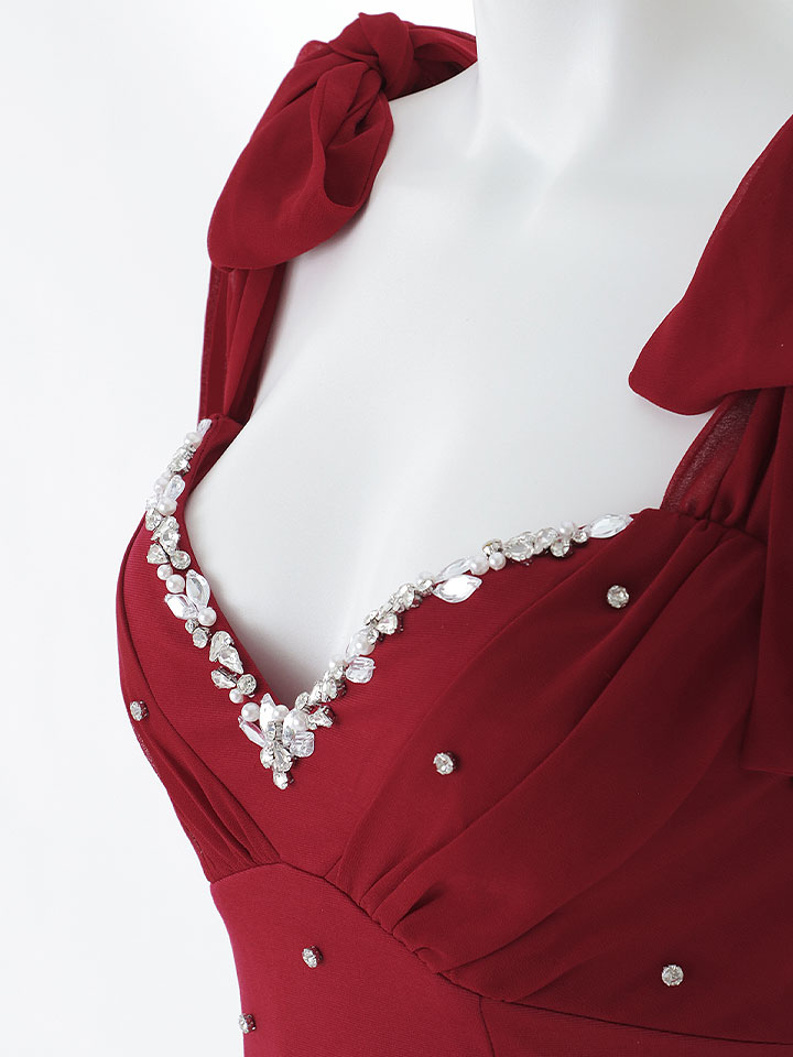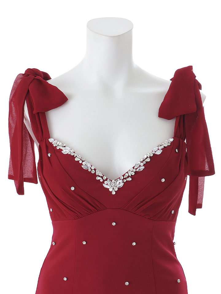 肩紐のリボンと胸元のビジューが華やかさをプラスし、輝きを放つデザイン。