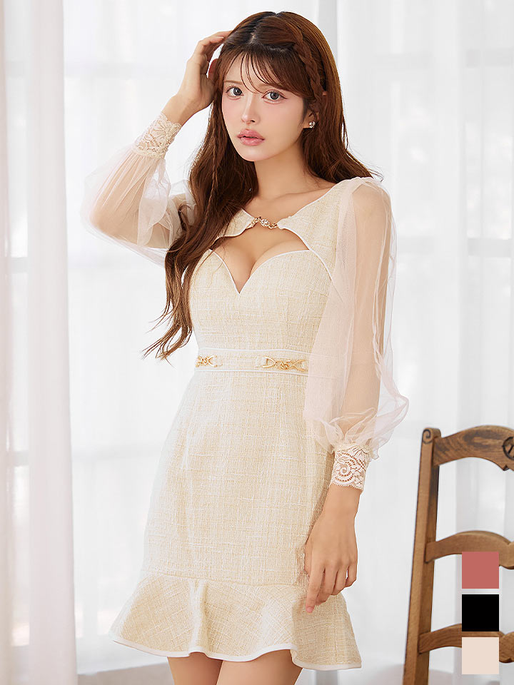 【送料無料!】チュール袖ウエストベルトツイードミニドレス/キャバドレス【S-Lサイズ/3カラー】[OF03-X] 【YN】dzc [5053YNdzc-250922-1]