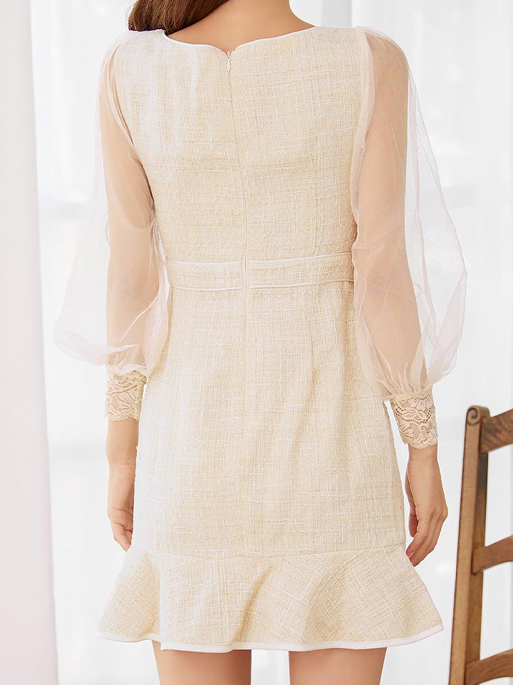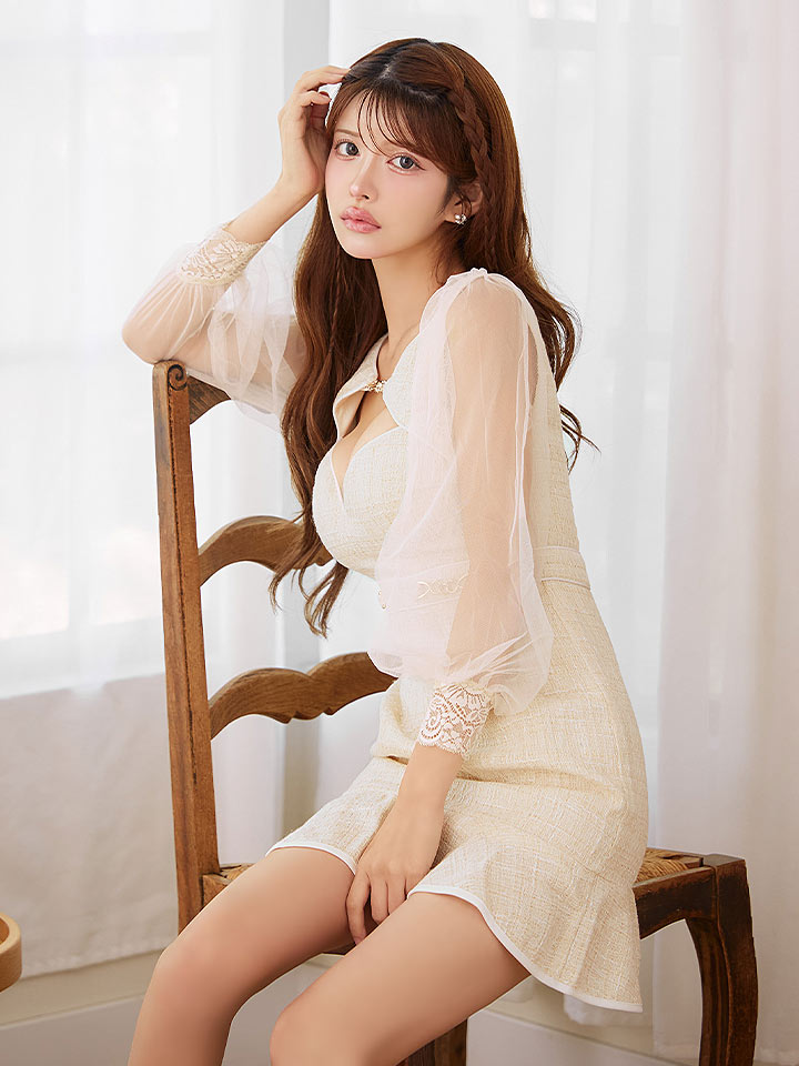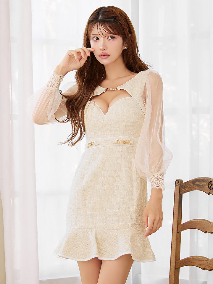 #ベージュ #ミニドレス/ミニ丈 #ワンピースドレス #ツイード #袖あり(ロングスリーブ・長袖) #谷間見せ(魅せ) #背中隠し(ブラOK) #マーメイド #アイボリー #まりん着用 #かるあ着用 #ネクスト銀座 ゆめ