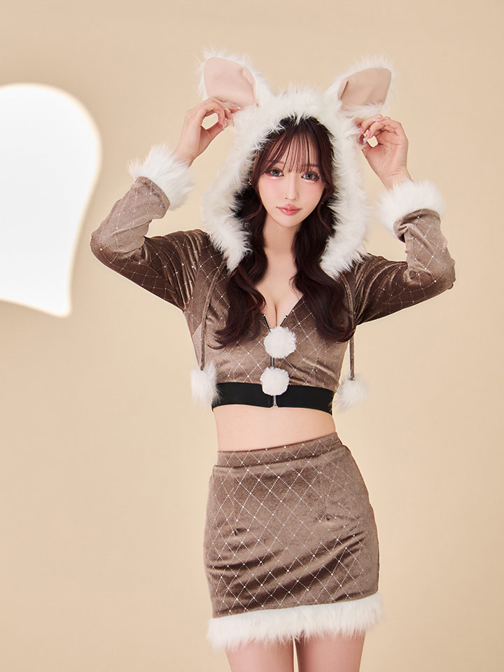 あざと 甘い スイート バニー ばにー 兎 ウサギ うさぎ ウサ耳 ラビット バニー 可愛い アニマル 動物 コスプレ ビジュー チェック フード オールインワン ブラウン