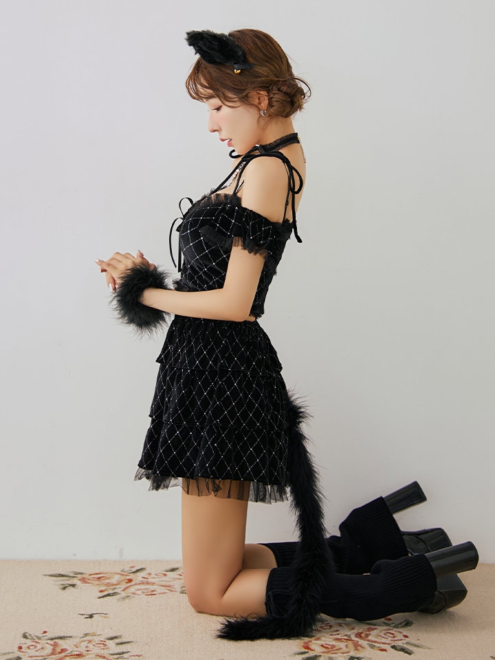 【即日発送】【ハロウィン】キャットオフショルビジューセットアップ【コスプレ6点セット】【XS-Lサイズ/3カラー】[HC03]