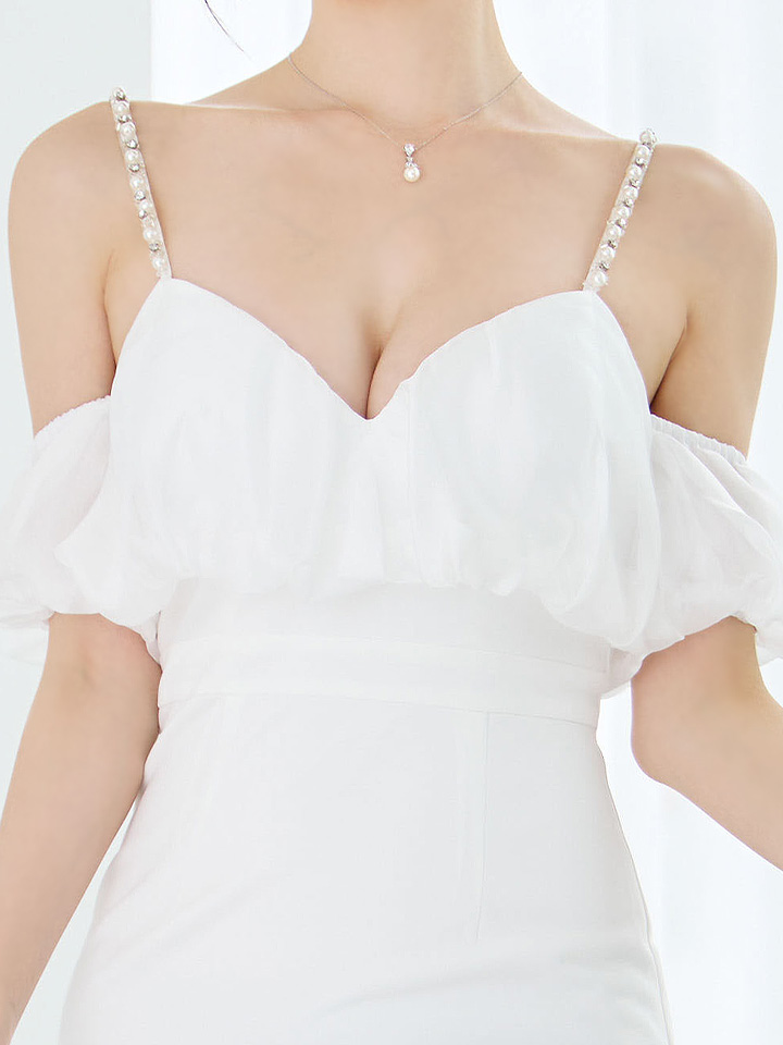 オフショルダーで肩周りをカバーしつつ、程よい肌見せと大胆なスリットで大人の色気を演出。