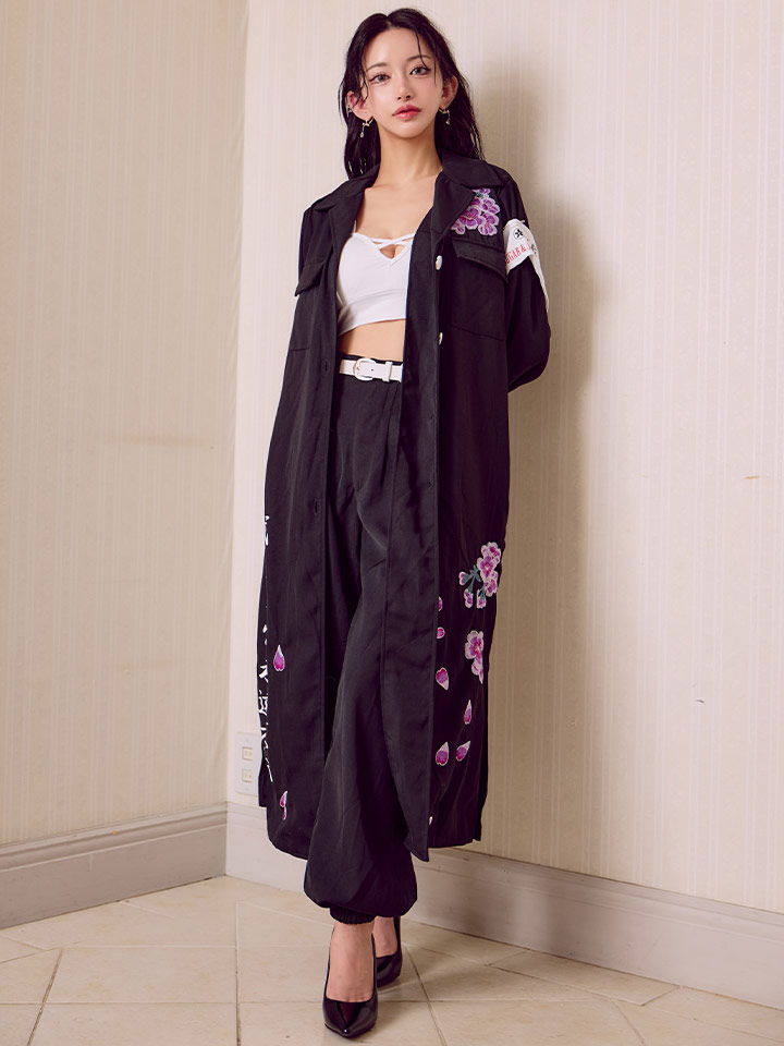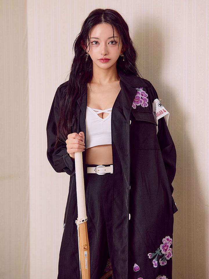 B:約〜117cm/ W:約95〜105(後ろゴムあり)/ H:約〜123cm 袖丈:約58cm 袖口:約24cm 肩幅:約41cm 着丈(羽織):(脇下)約90cm 着丈(ボトムス):約108cm 股下:約80cm |