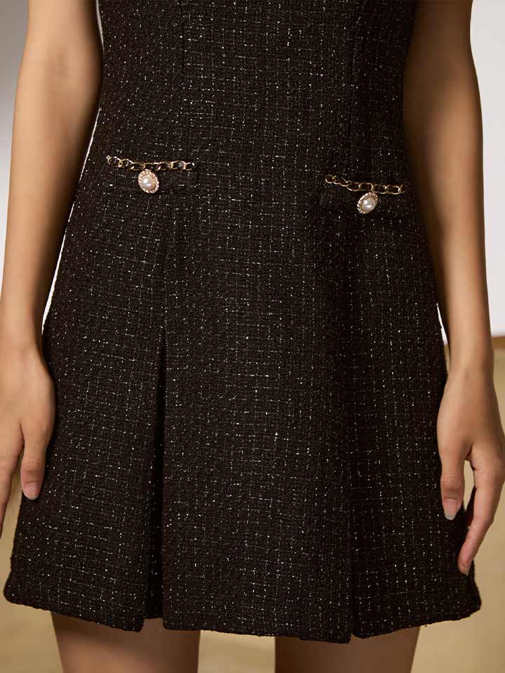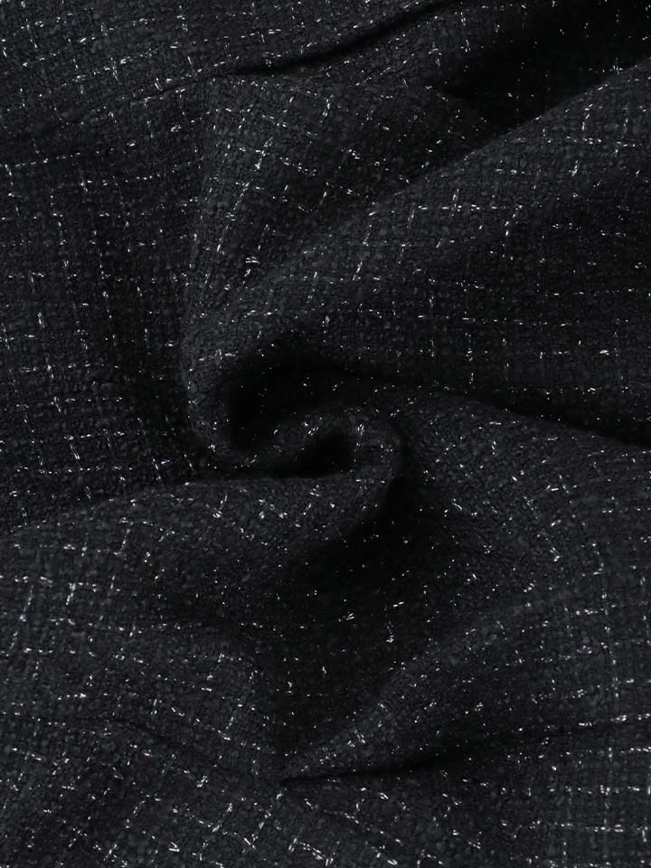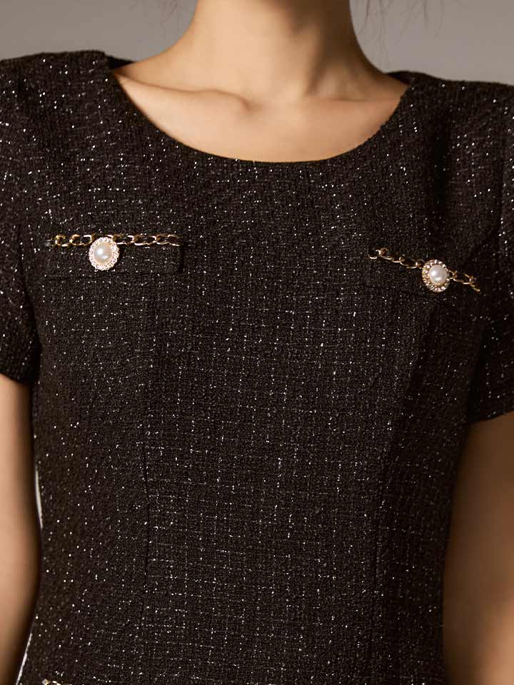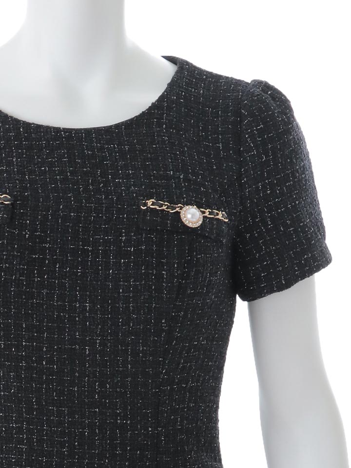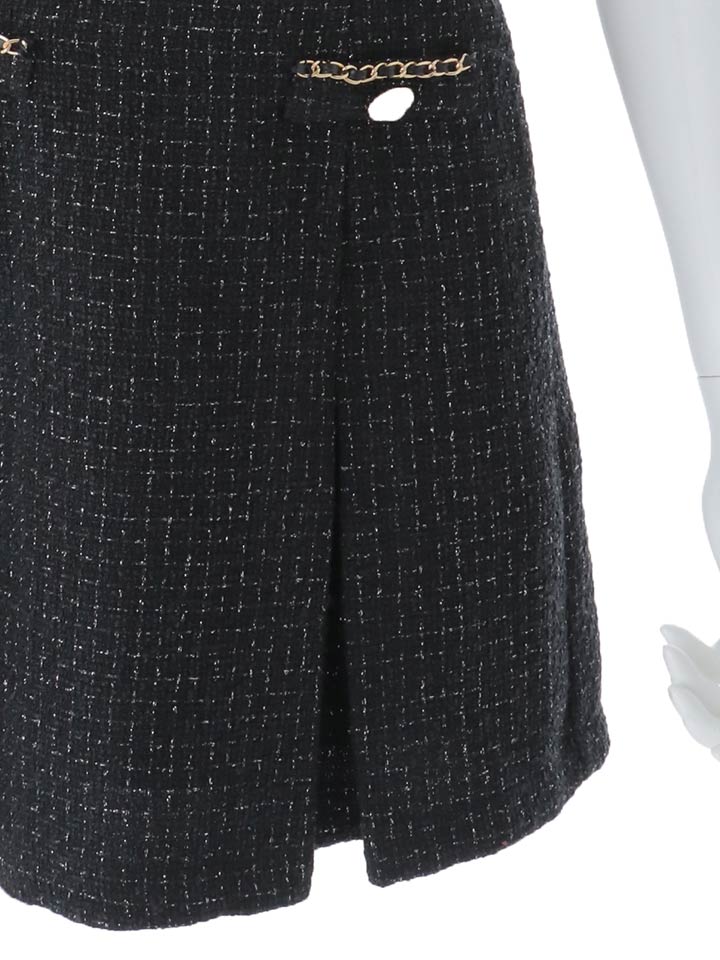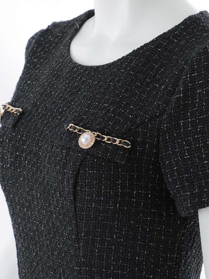 ツイード生地と相性抜群なチェーン&パールボタンの組み合わせがベストマッチ。