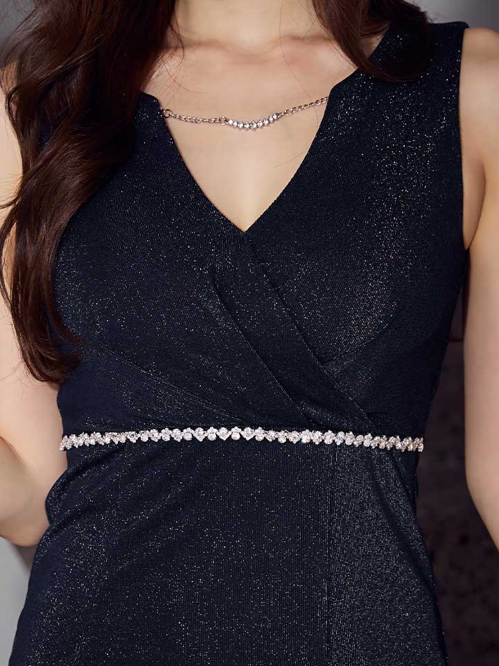 Vネックのシルバー装飾がデコルテを華やかに彩り、ウエストのビジューラインで高級感をプラス。