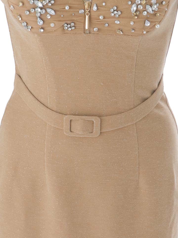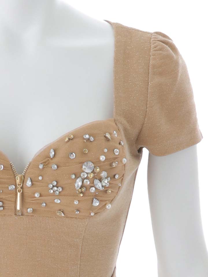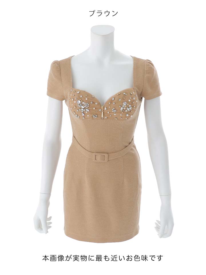 胸元のビジューが華やかに輝き、大人の女性らしさを際立たせます。