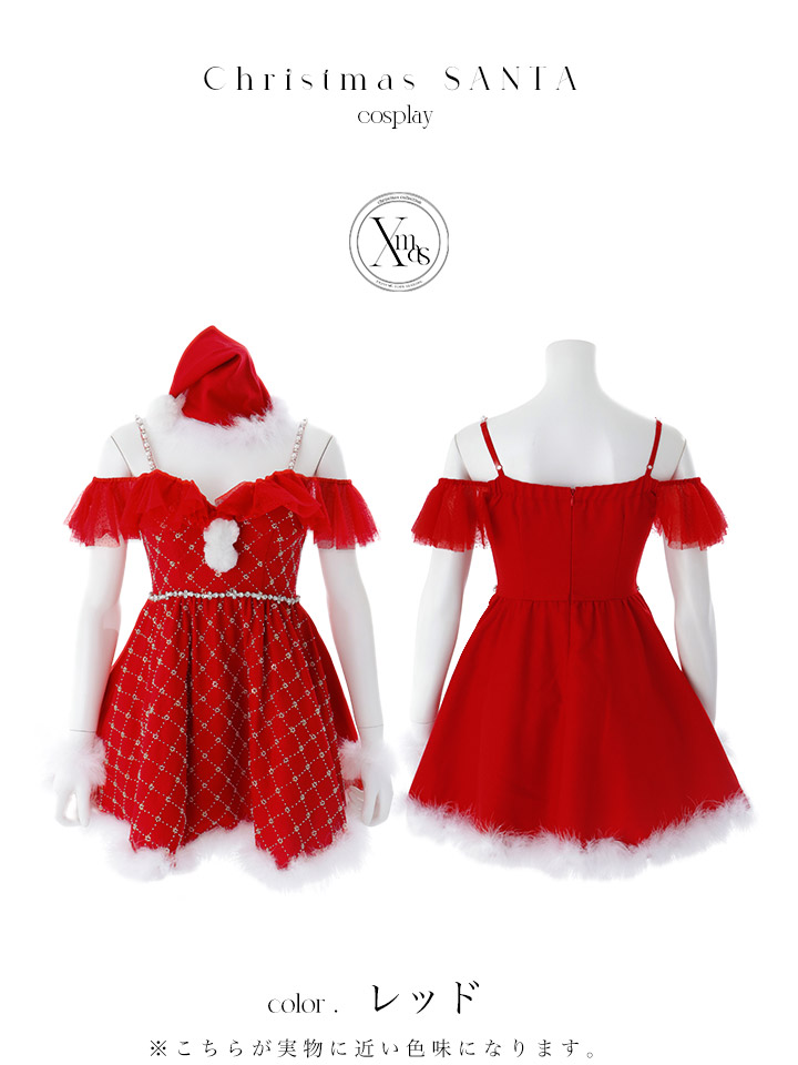 【即日発送】【サンタ】ビジュー格子柄オフショルサンタコスプレ【コスプレ4点セット】【XS-Lサイズ/1カラー】[OF04]
