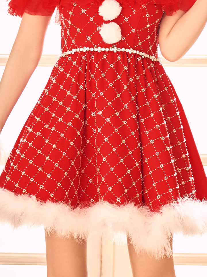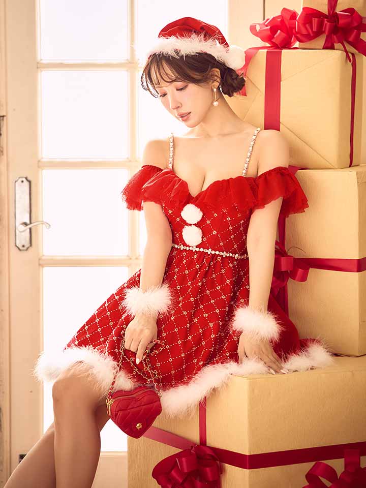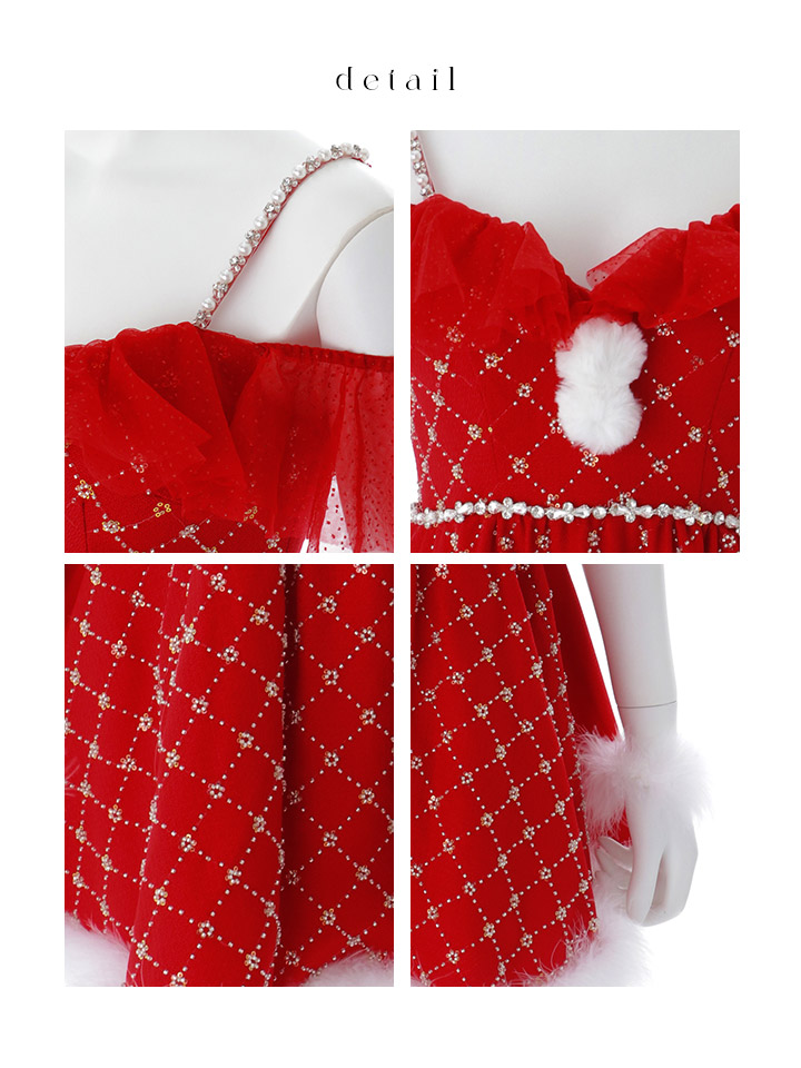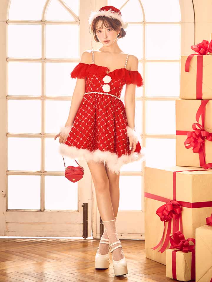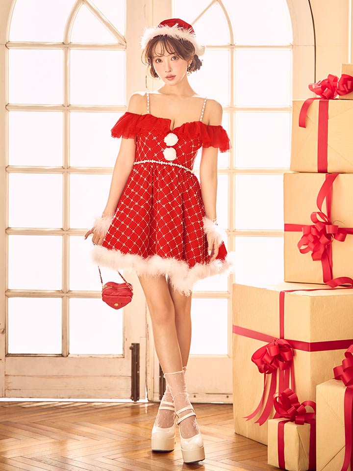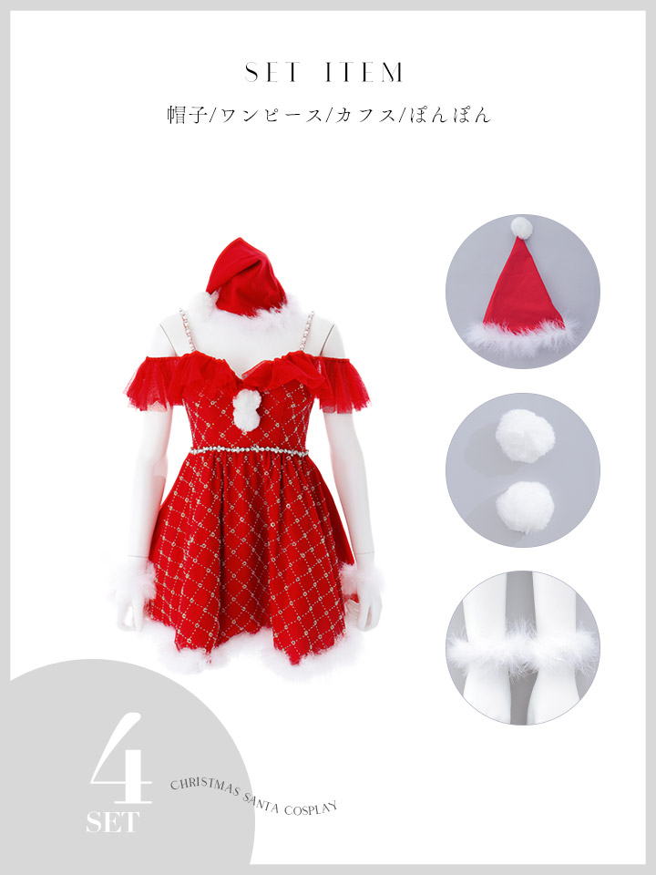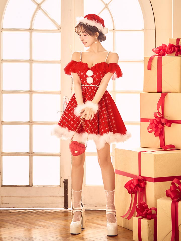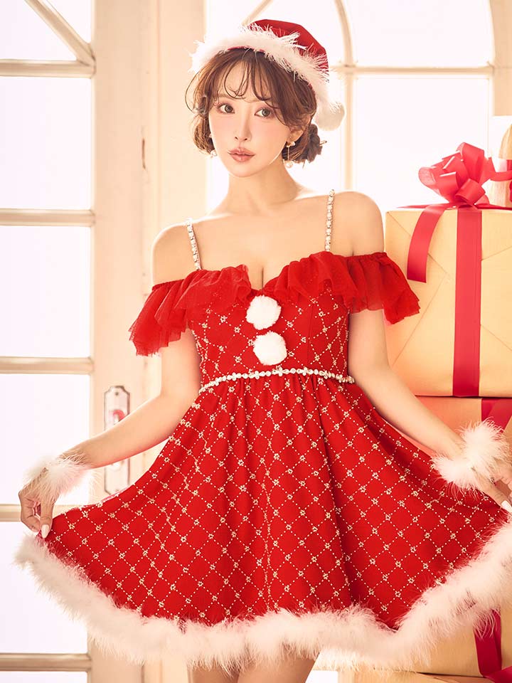 【即日発送】【サンタ】ビジュー格子柄オフショルサンタコスプレ【コスプレ4点セット】【XS-Lサイズ/1カラー】[OF04] [SS-158-YN-dzw-R-25MY]