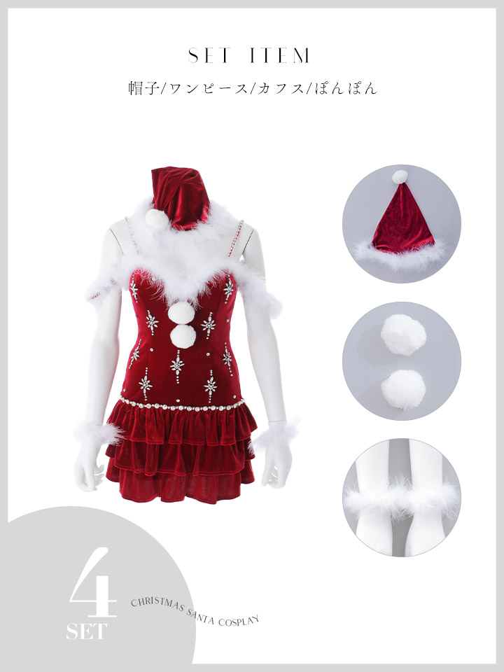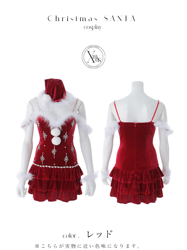 【即日発送】【送料無料!】【サンタ】 スノーフレークビジューフレアサンタコスプレ【コスプレ4点セット】【XS-Lサイズ/3カラー】[OF01]