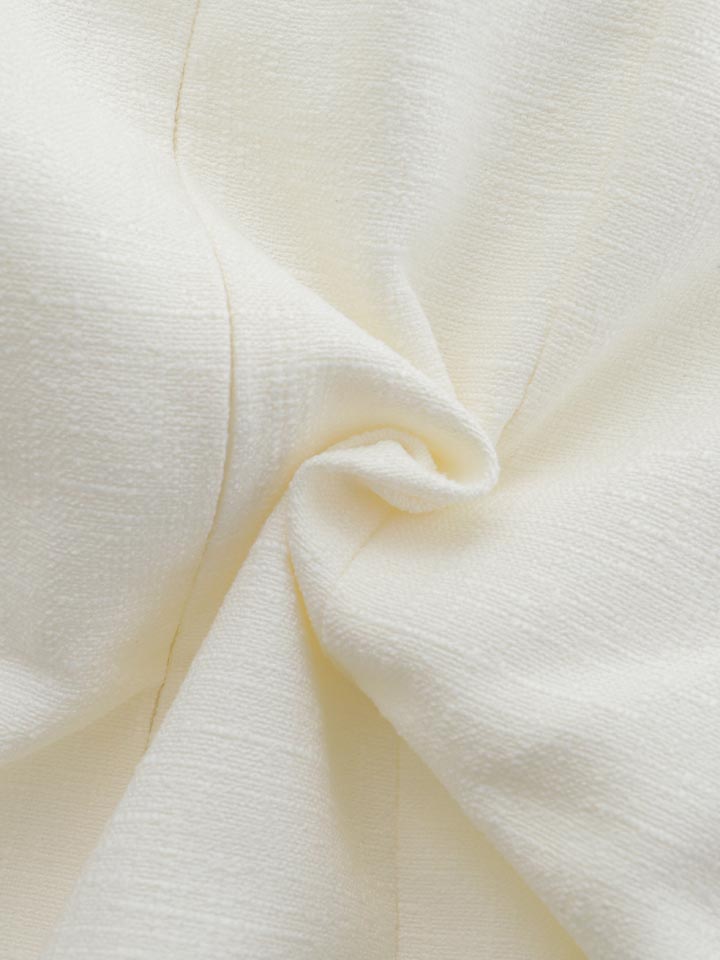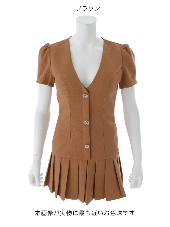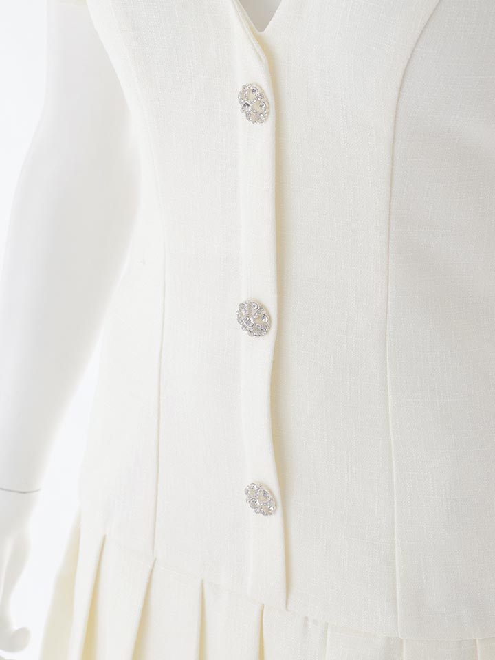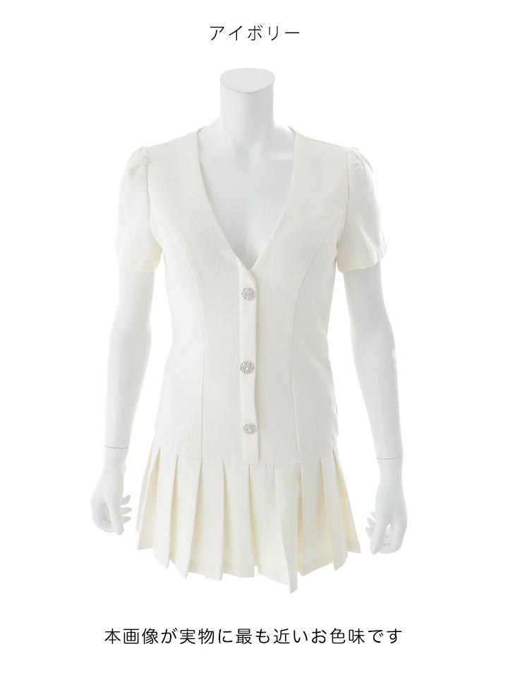 半袖デザインで抜け感をプラスしつつ、ビジューボタンが上品な華やかさを添えます。