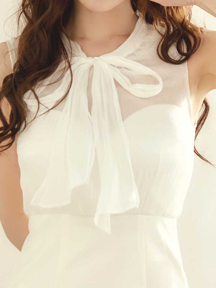 胸元のリボンが華やかなアクセントとなり、女性らしい曲線を美しく引き立てます。