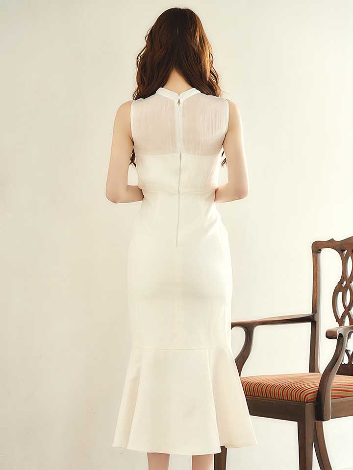 シアー素材のトップスが上品な抜け感を与えるマーメイドロングワンピース。