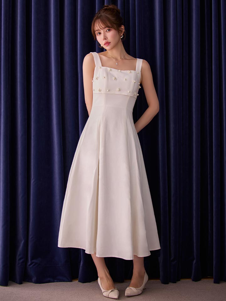 ノースリーブデザインとパールの装飾がほどよい華やかさを添える、綺麗めスタイルの一枚。