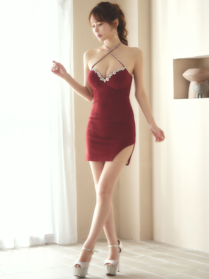 ビジューの輝きが華やかさを添える、色香漂うミニドレス。