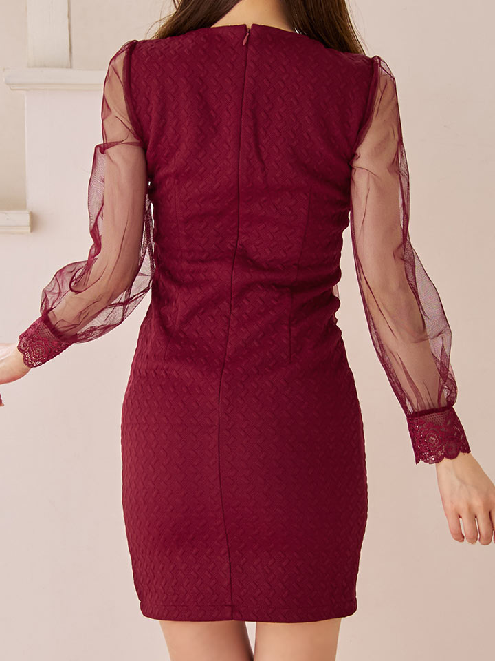 広く開いたデコルテのカッティング、チュールスリーブから透ける肌感など
