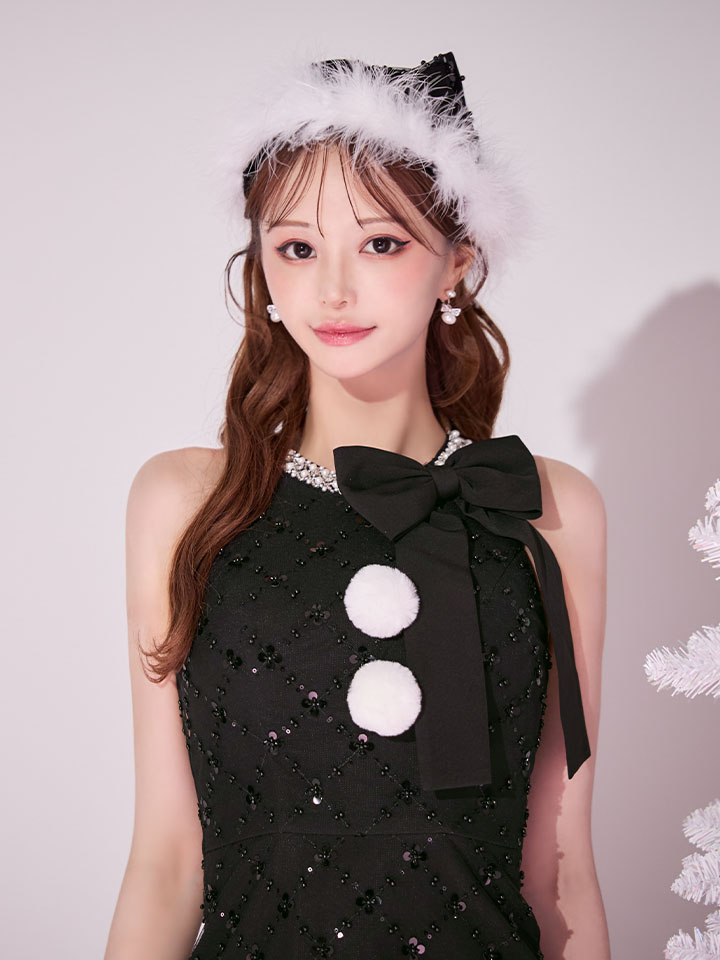 煌めくネックラインのビジューが顔まわりを華やかに彩り、