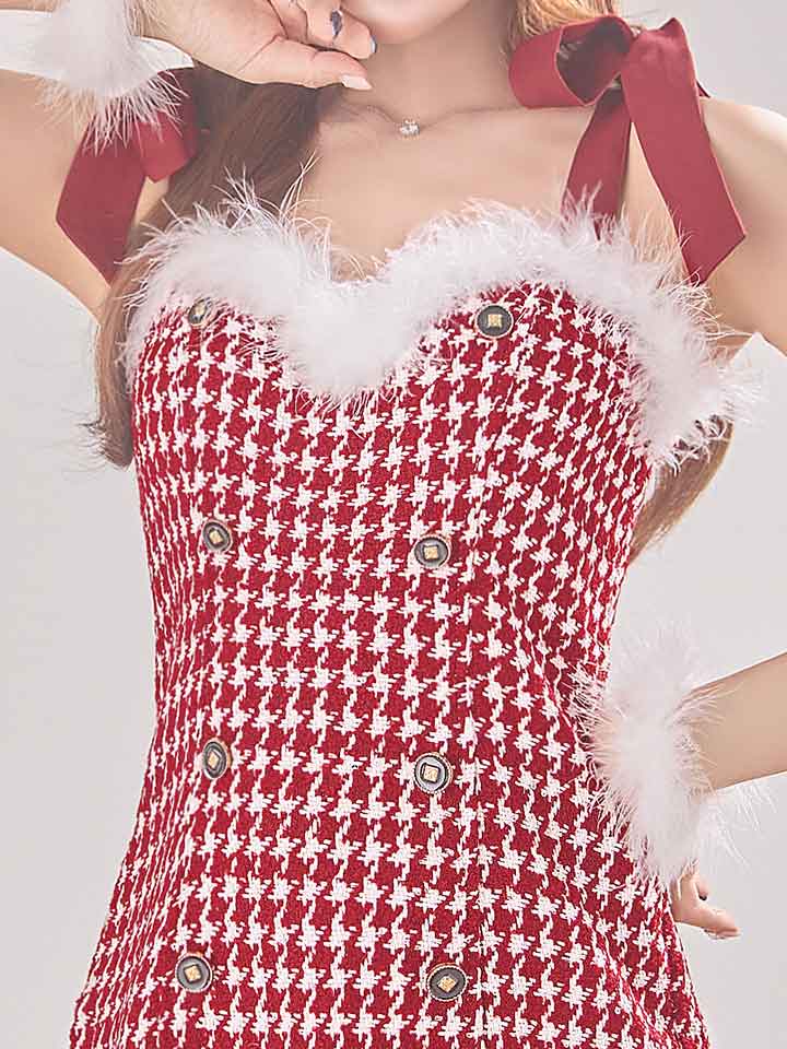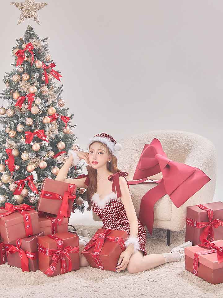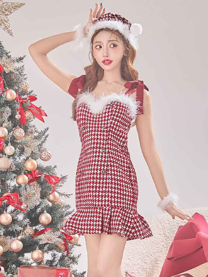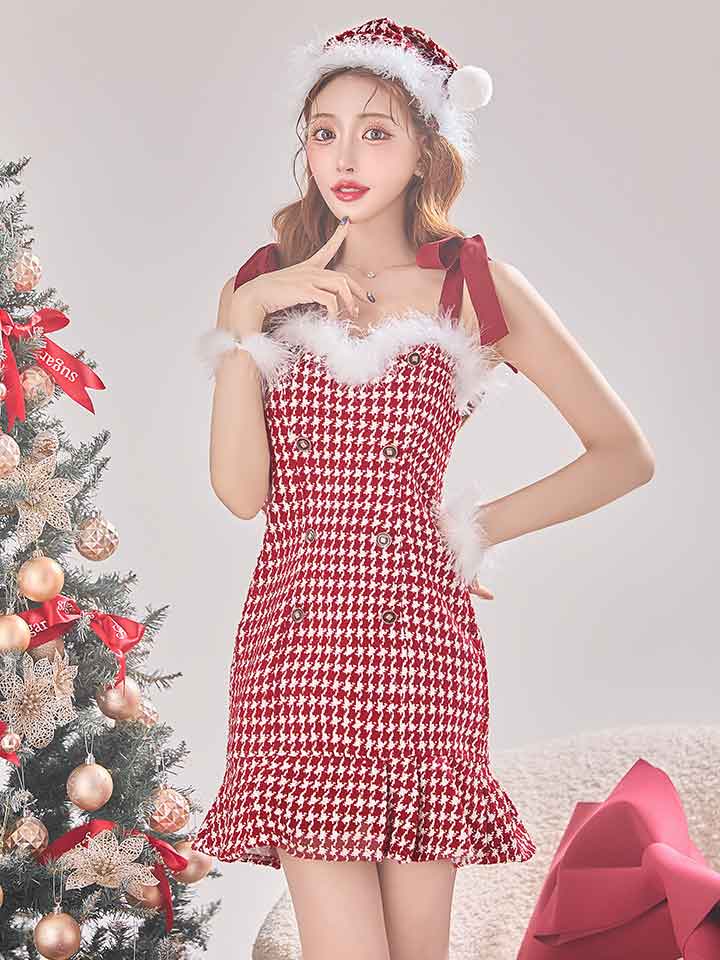 - > 【サンタセール!】【サンタコス 4点セット】【S-Lサイズ/2カラー】肩リボンブラック千鳥タイトサンタコスプレ[YMT]