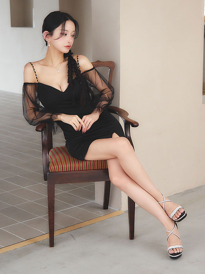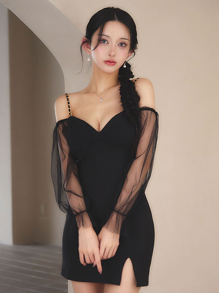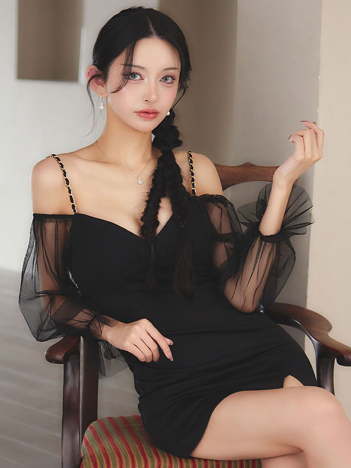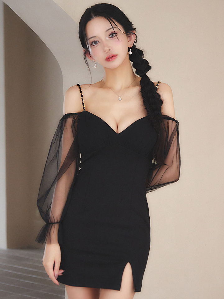 チェーンキャミソールチュール袖ミニドレス/キャバドレス【XS-Lサイズ/1カラー】[OF03] 【YN】dzwz [5210YNdzwz-251031-1]