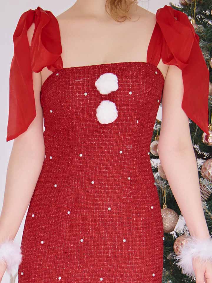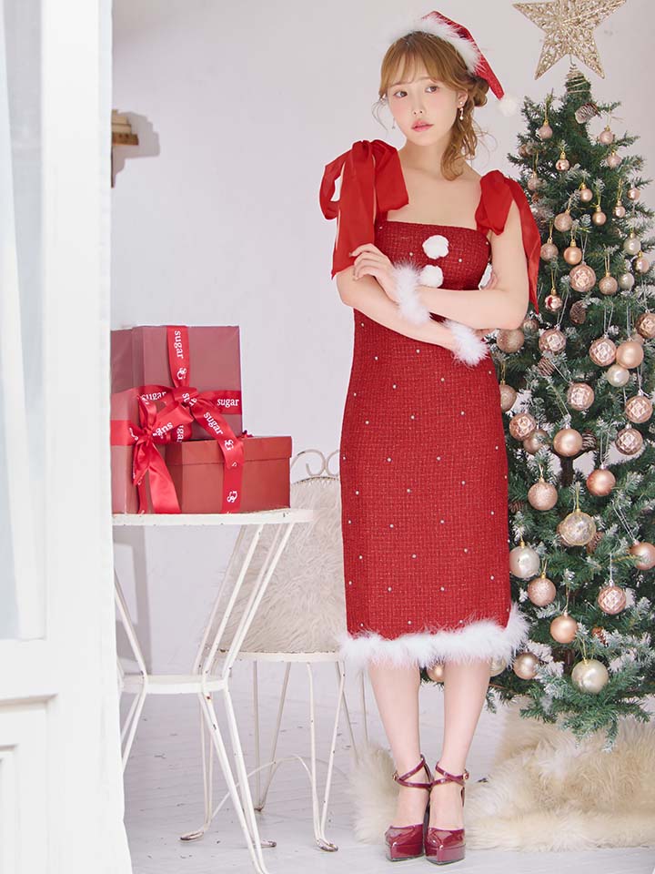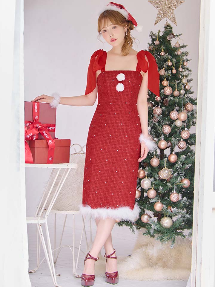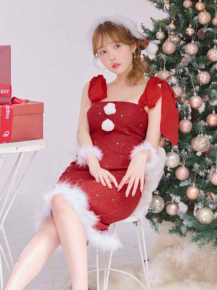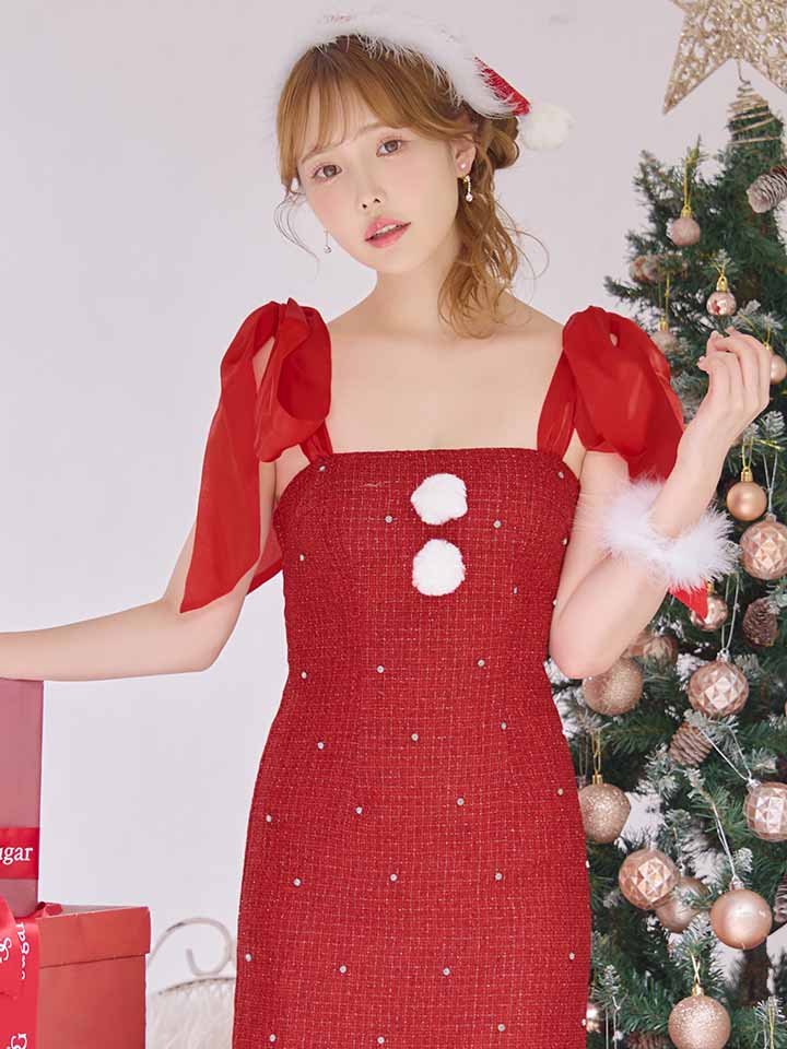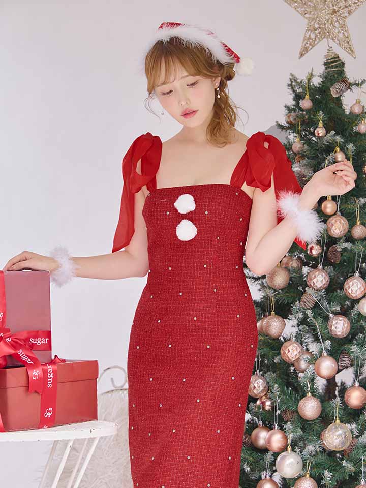 贅沢にあしらったビジューがきらびやかなツイードワンピースサンタコス。