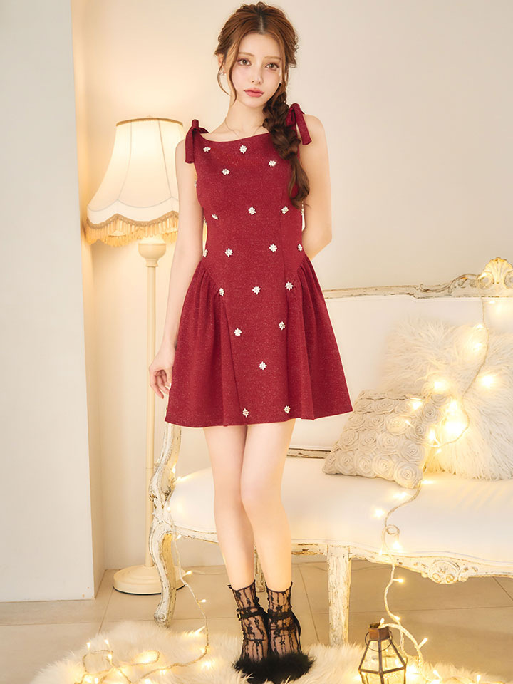 両サイドの肩リボンがさりげなく可愛さを添えるミニドレス。