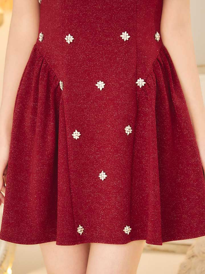 広がるフレアスカートが動きに合わせて華やかに揺れ、ボートネックで上品な印象に。