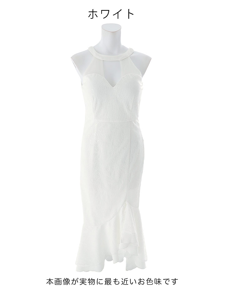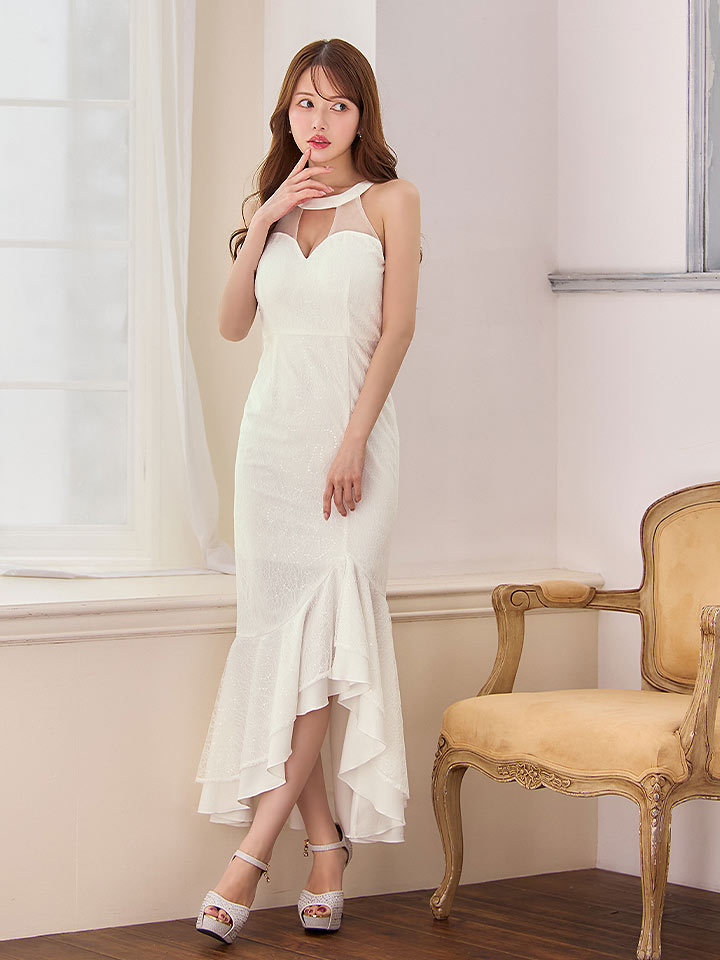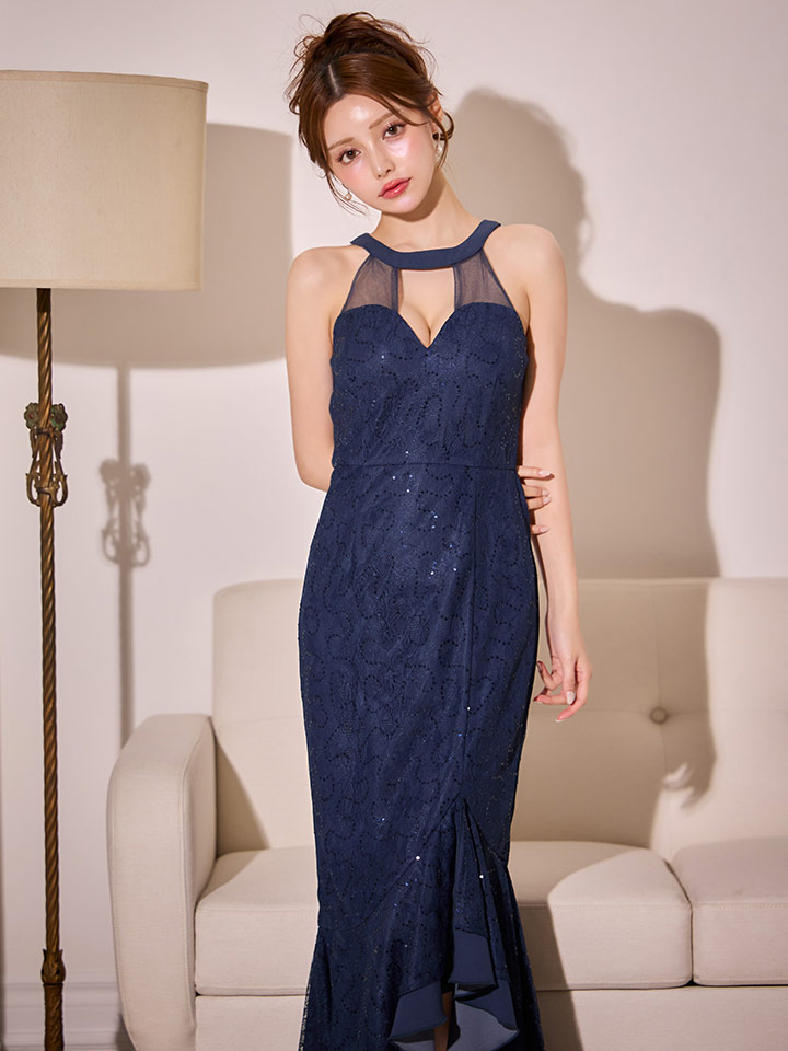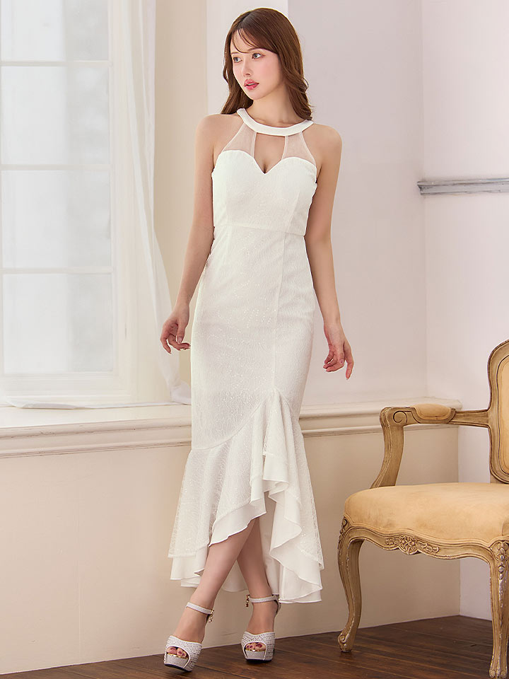 きらめくレースが全体を美しく飾り、視線を集める華やかさを纏える一着です。