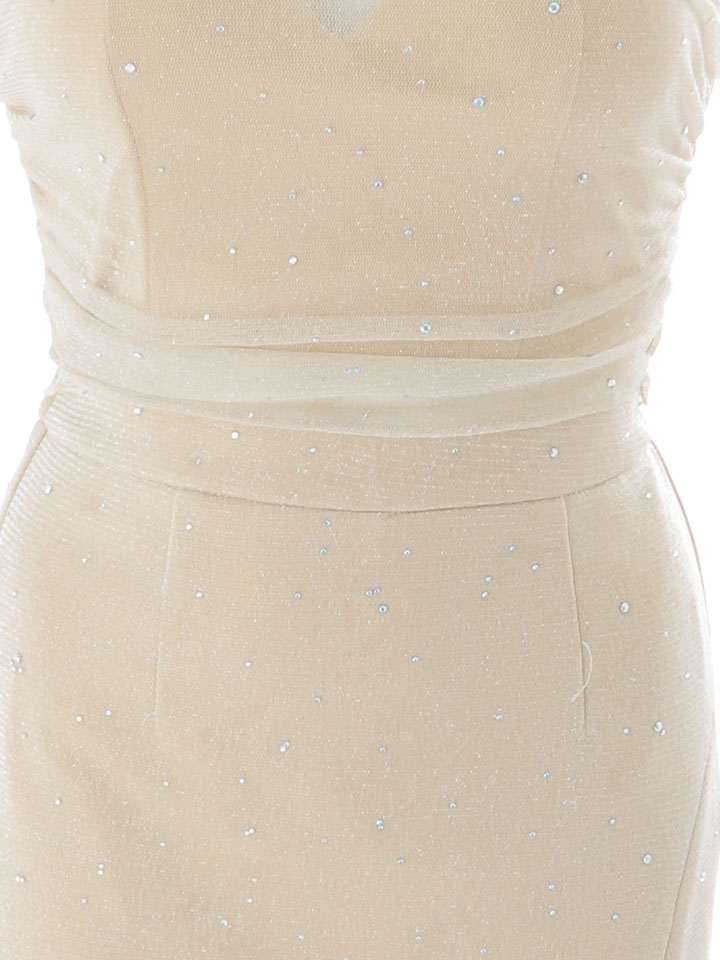 トップス部分のチュールデザインからほんのり肌が透け、抜け感を演出するロングドレス。
