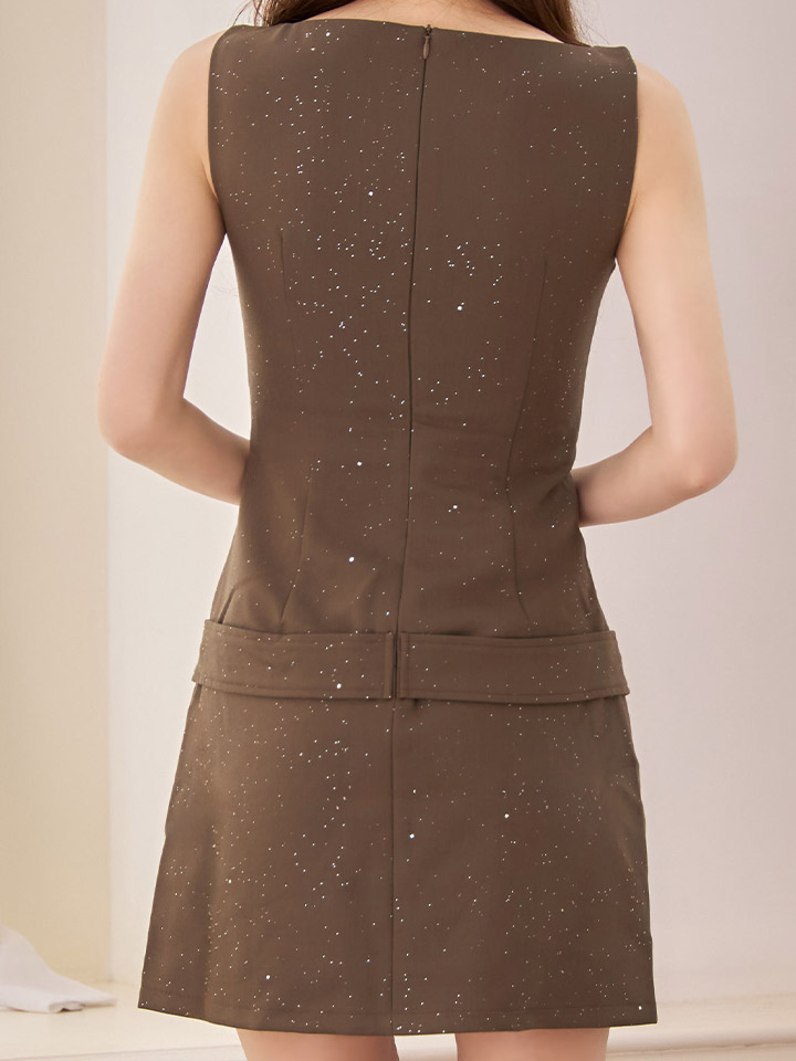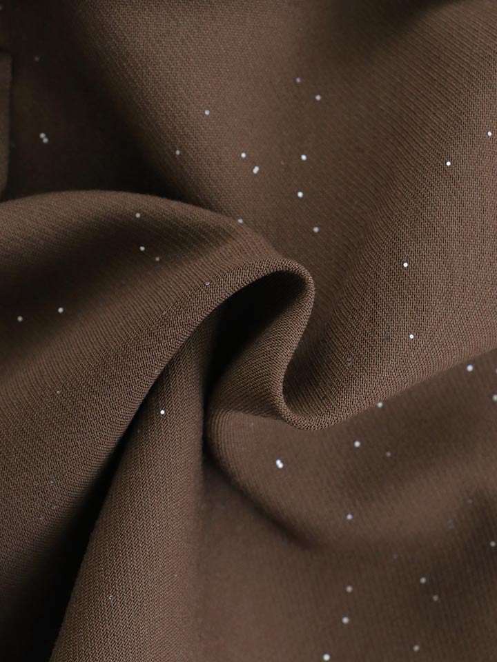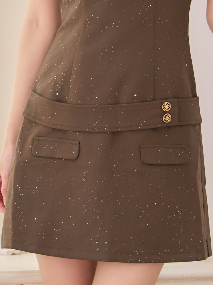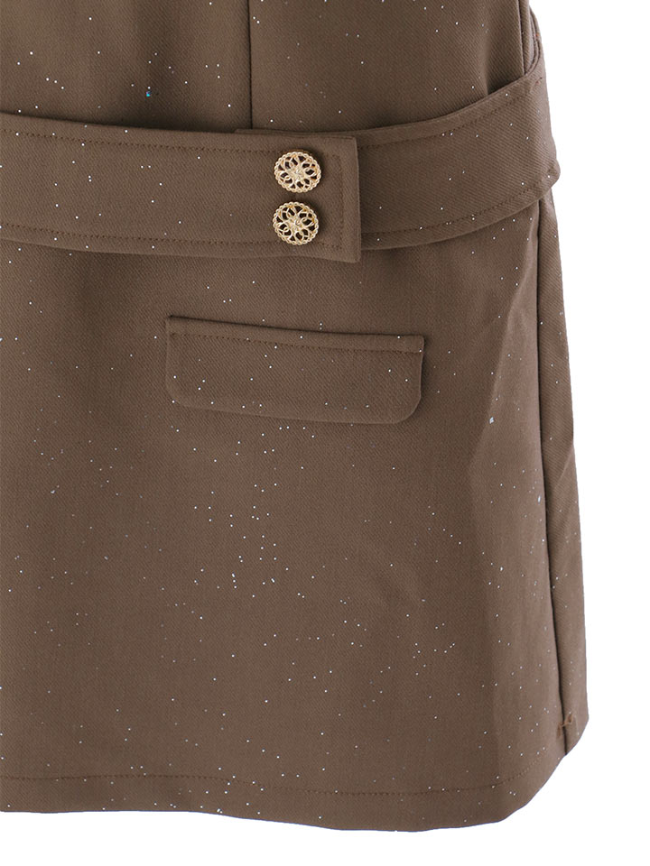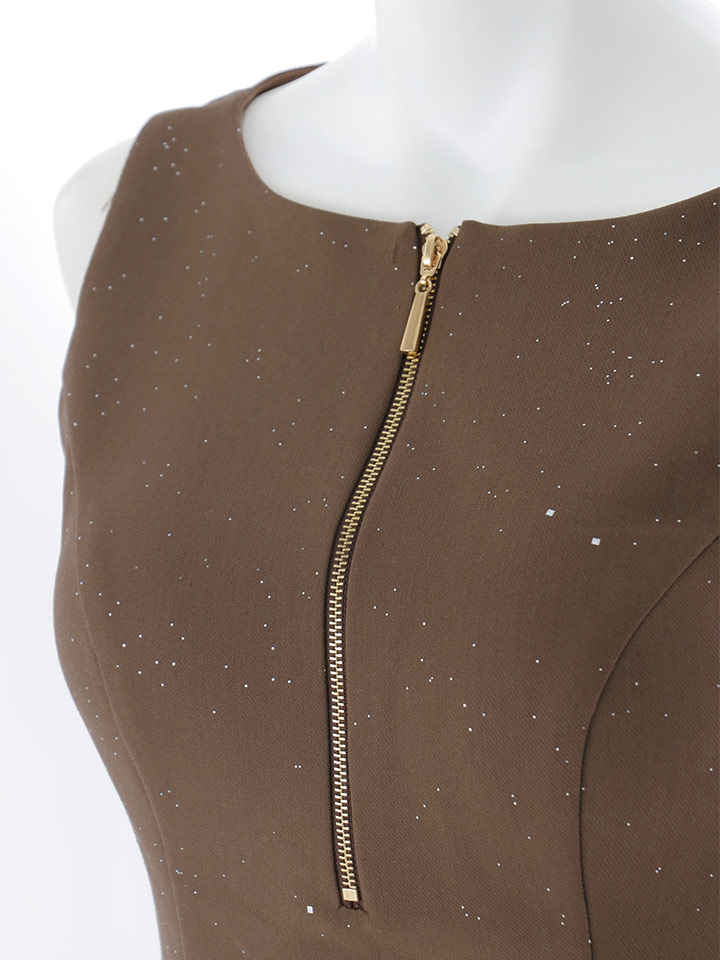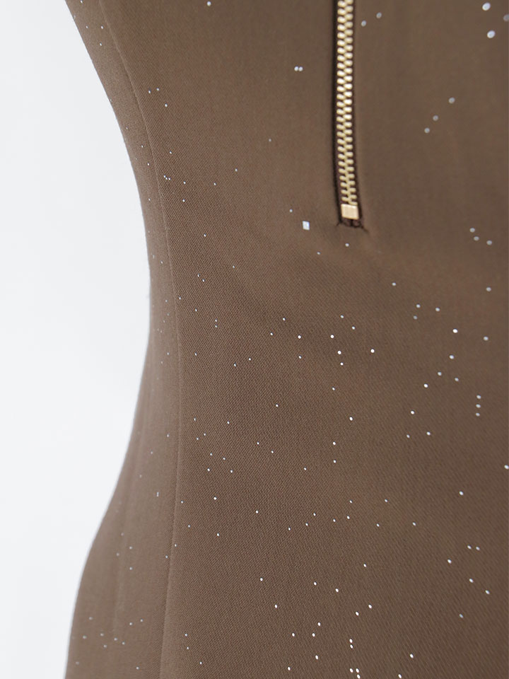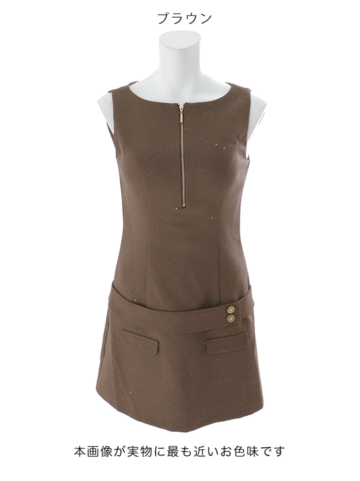 キラキラスーツ生地の上品な輝きと、胸元のジップ仕様で自由に雰囲気を変えられるのもポイント。
