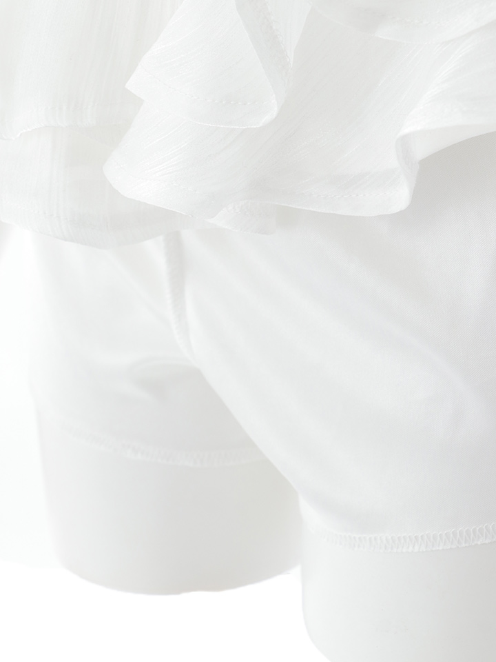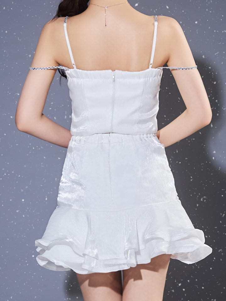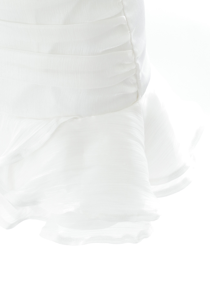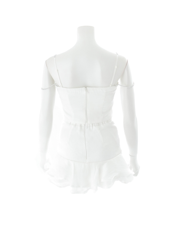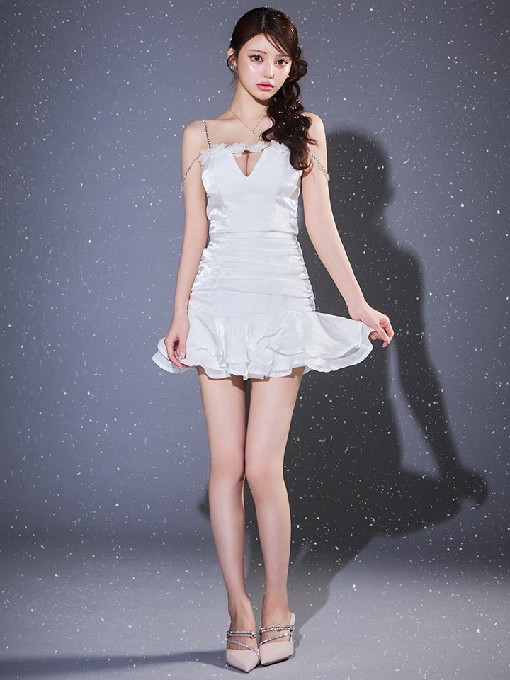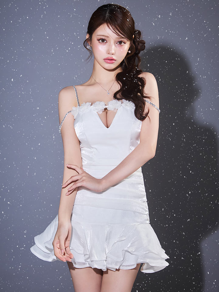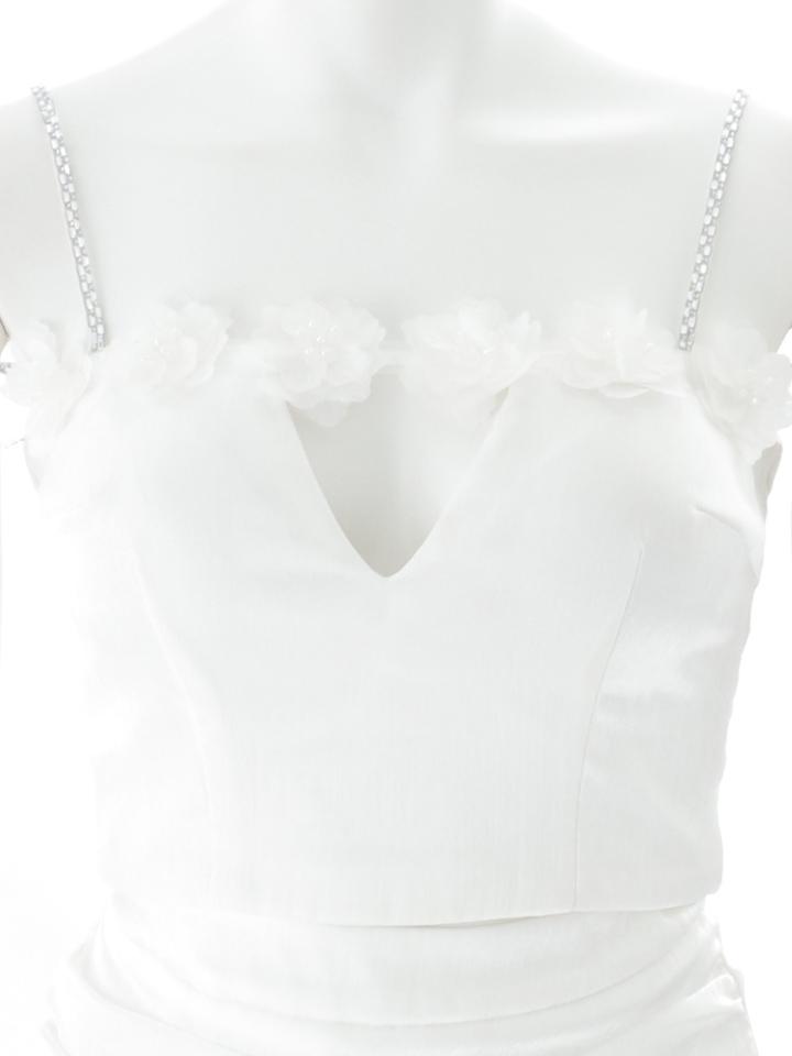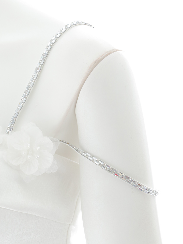 胸元のお花の装飾が華やかさを添え、二の腕のチェーンが煌びやかでかわいらしいアクセントに。