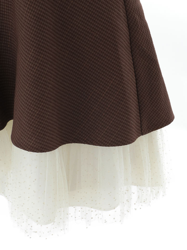 重なるチュールが華やかで、フレアスカートが女性らしいシルエットを演出します。
