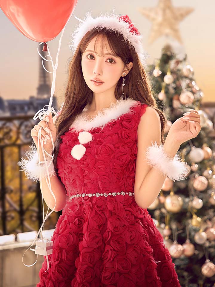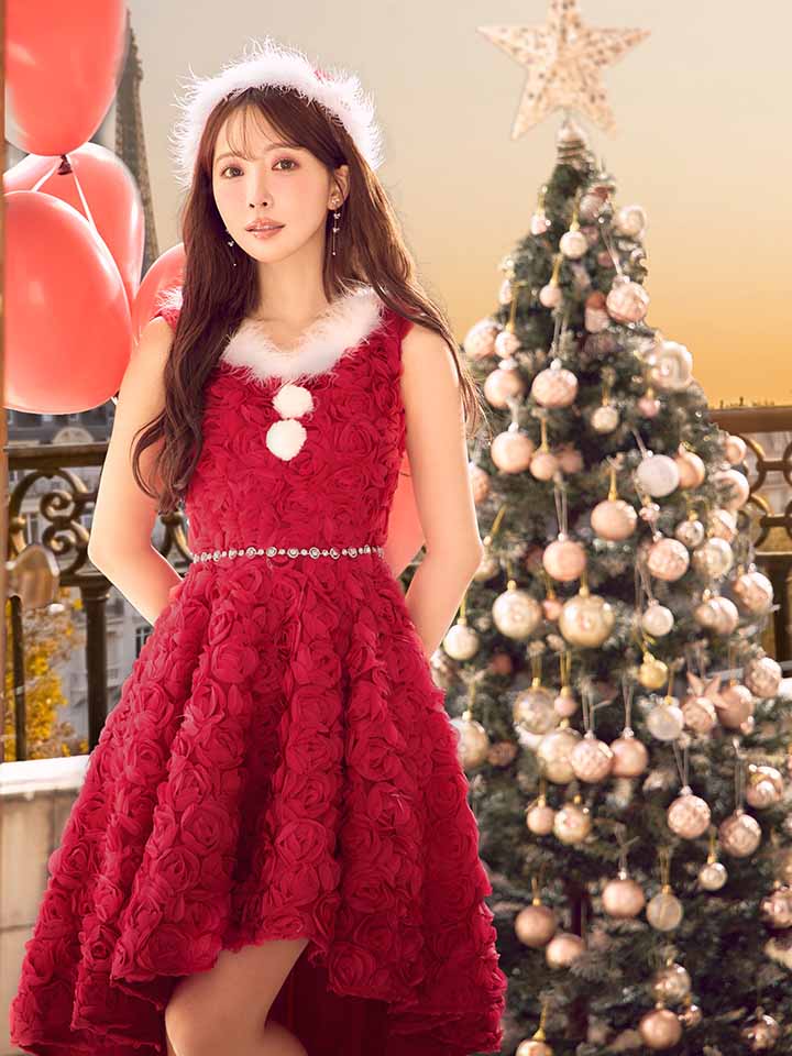 #フレア #ワンピース #ノースリーブ #ショートインスカート #立体ローズ #クリスマス #パーティ #サンタコス