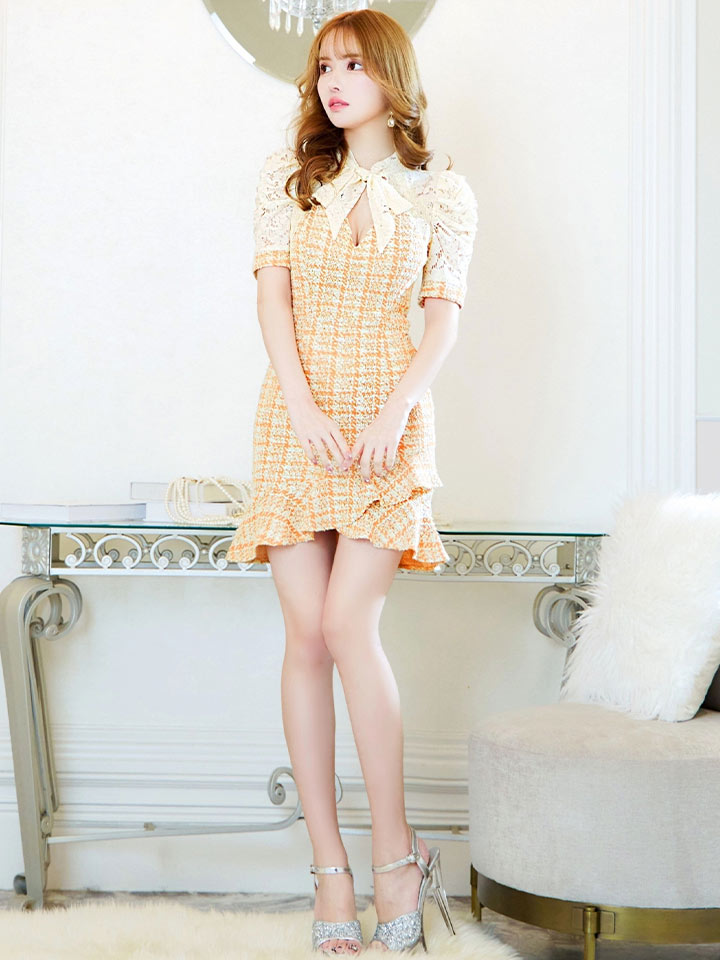 リボンネックレースツイードマーメイドドレス/キャバドレス【XS-Lサイズ/3カラー】[OF05]