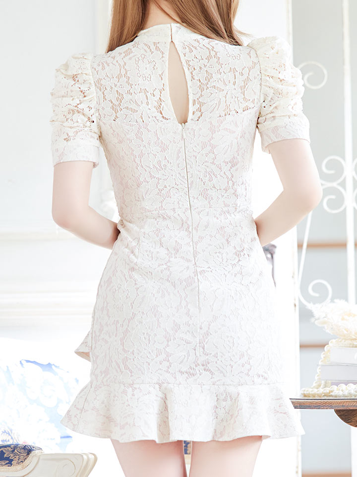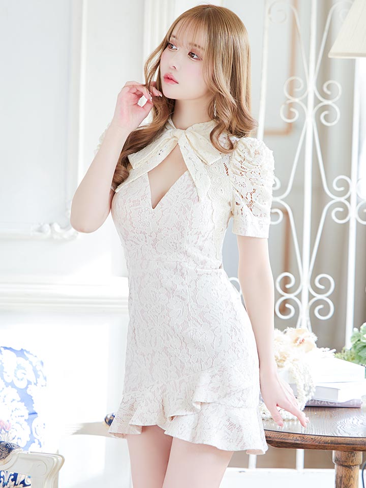 フラワーレースにリボンモチーフがフェミニンな雰囲気のミニドレス。