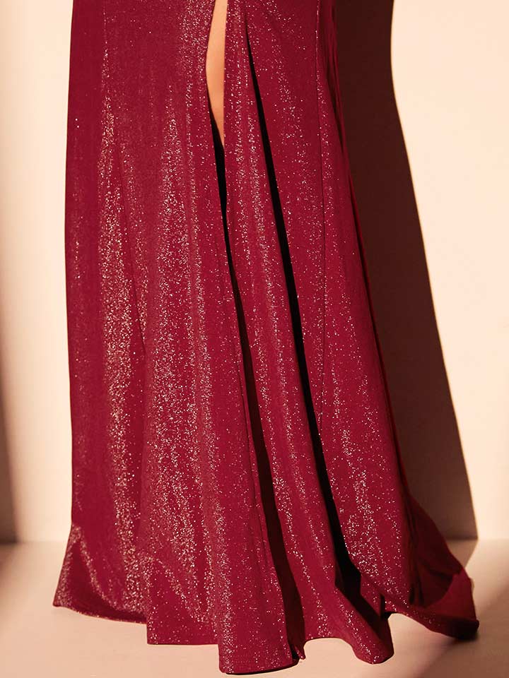 ラメたっぷりの気品あふれる生地が華やかで優雅な大人セクシーロングドレス。
