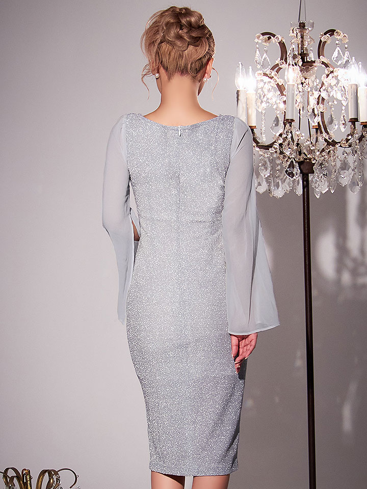 袖付きデザインが上品なミディアムワンピース。 谷間を美しく魅せるカットと、首元のラウンドビジューデザインが華やかさをプラス。