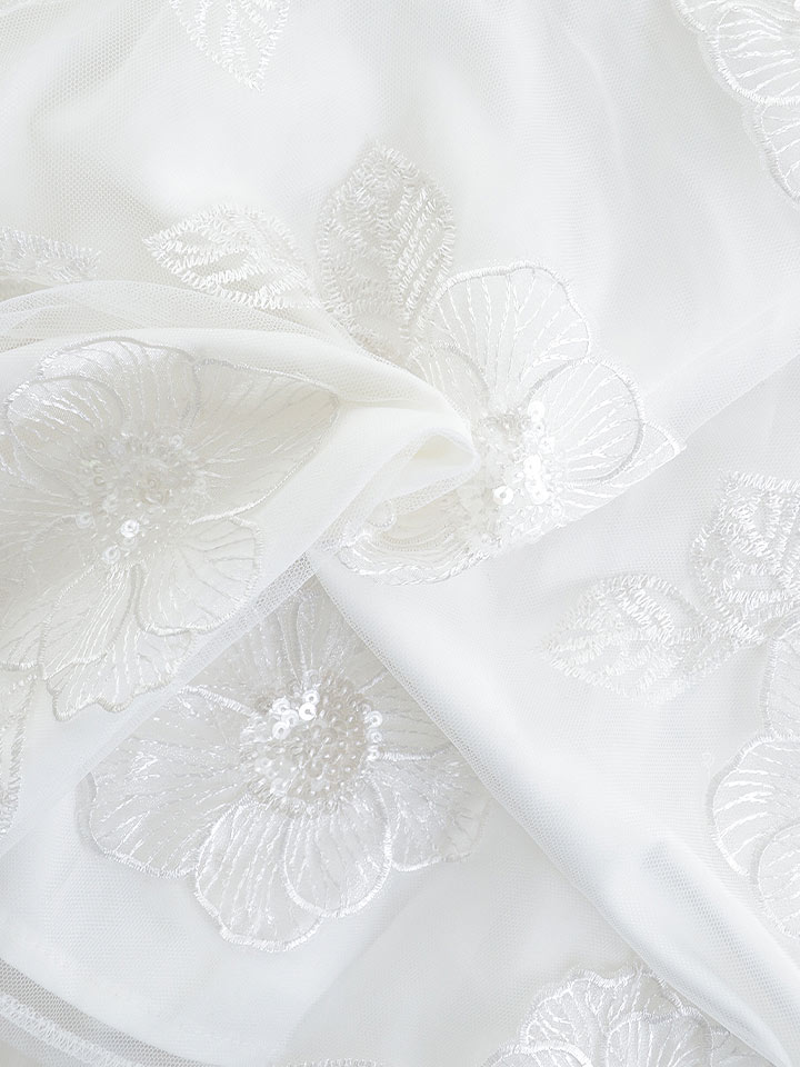 キラキラと光をまとったお花模様のシフォン生地が、歩くたびに華やかさを放つ一着。