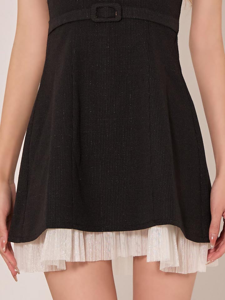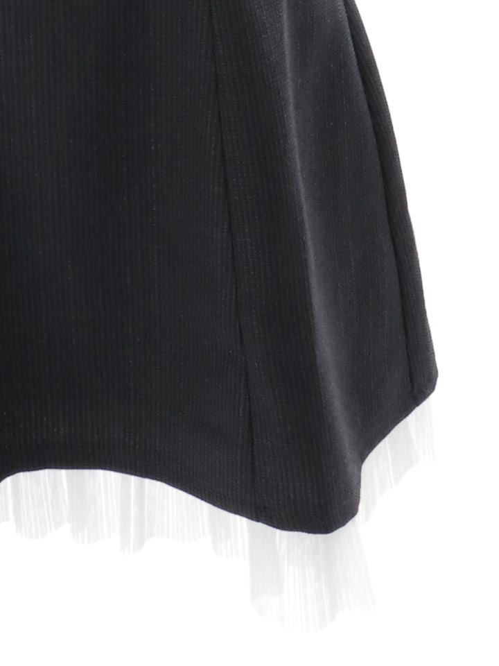 スカート下には軽やかなシフォンを重ね、ウエストにはフェイクの細ベルトをあしらった可愛らしいアクセントもポイント。