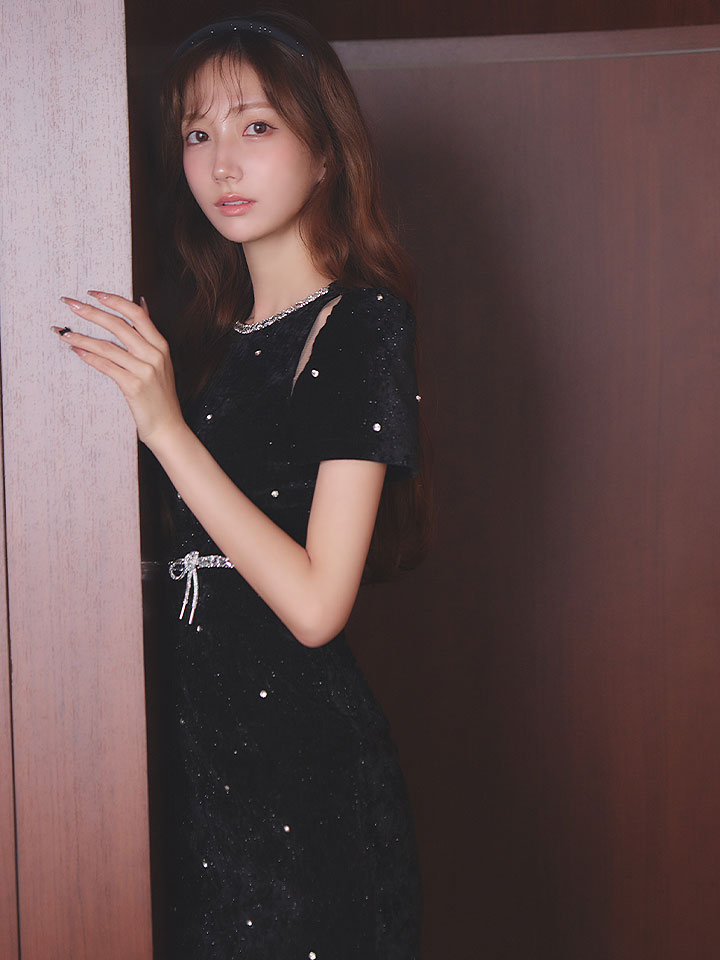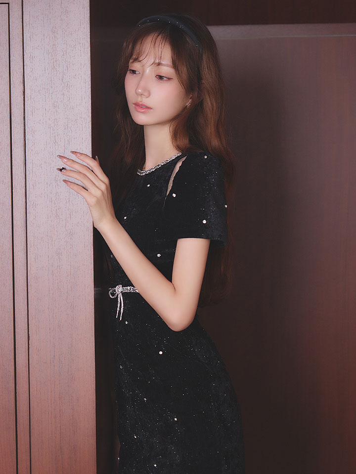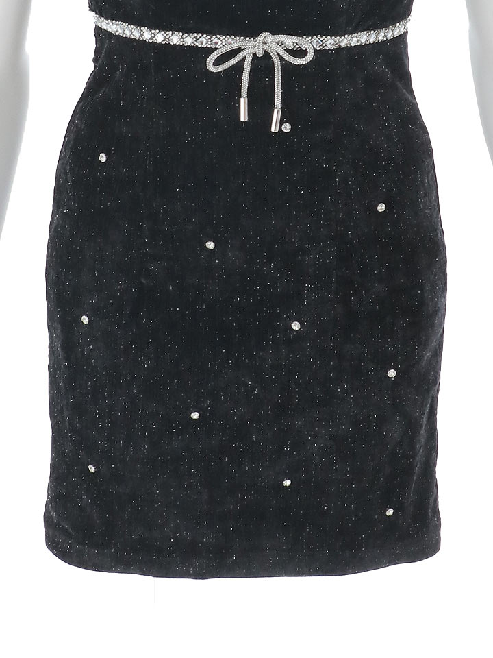ウエストにはビジューラインとビジューリボンをあしらい、タイトスカートが女性らしいシルエットを演出。