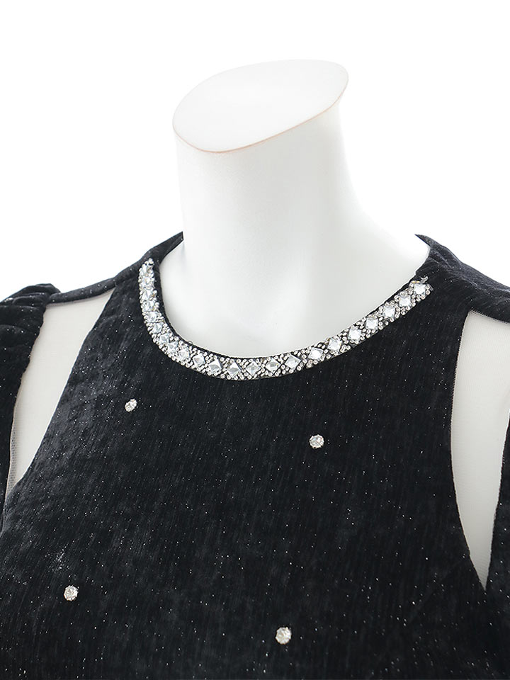 胸は閉じたデザインで上品さをキープしつつ、首元にはビジューが華やかさをプラス。