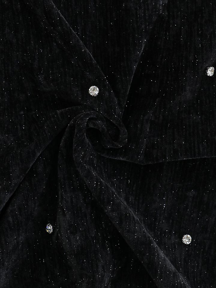 生地全体に散りばめられたビジューが光を受けて輝く、甘く華やかな一着。