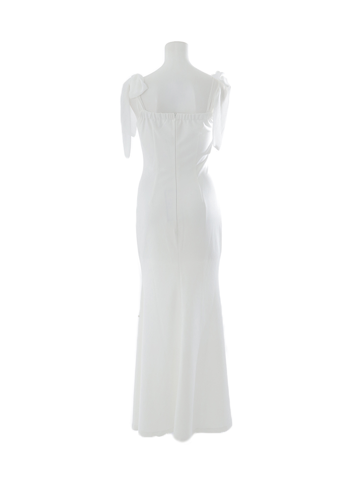 着心地のいいストレッチ生地がしなやかにフィットし、肩紐にはシフォンのリボンをあしらって甘さを添えた、大人可愛いドレス。