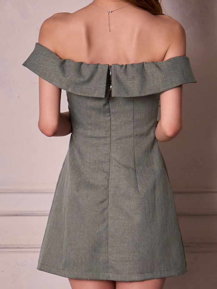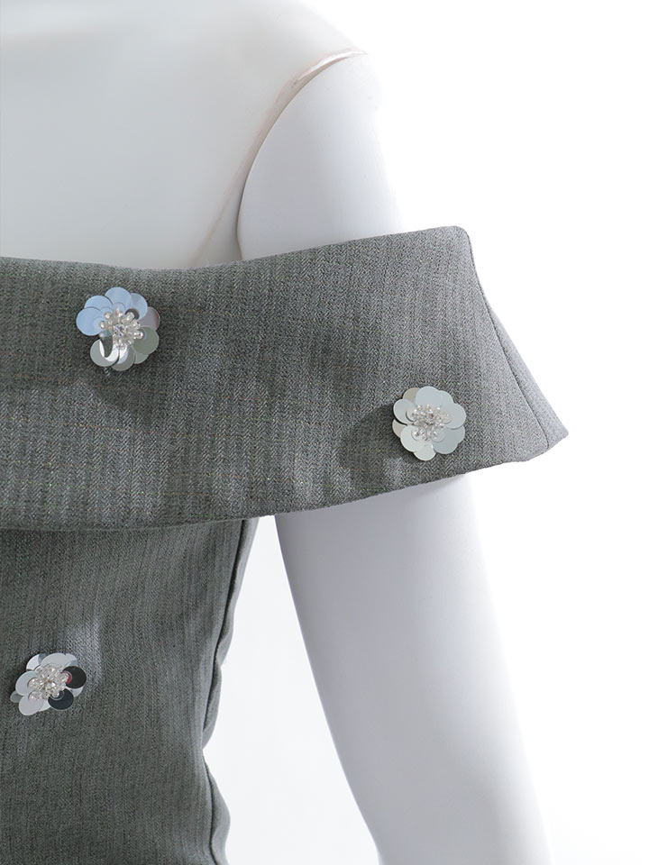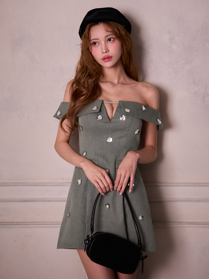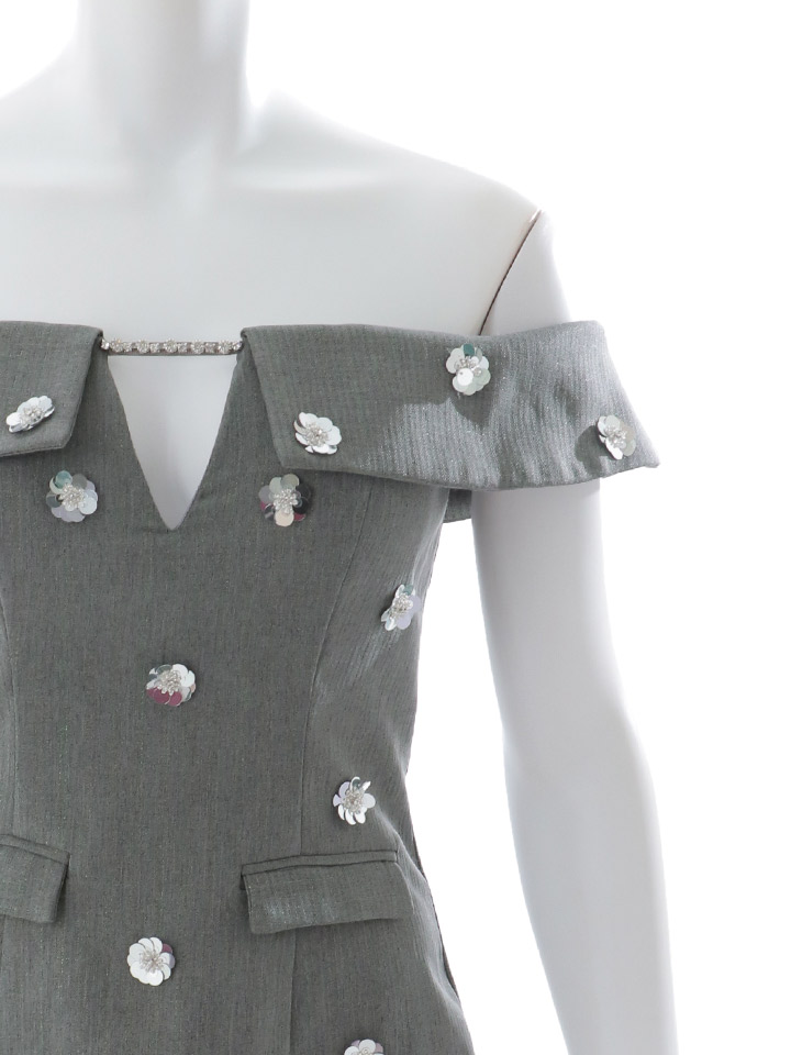 #グレー #るりぴ #ミニドレス/ミニ丈 スーツ生地 ビジュー #オフショルダー #谷間見せ(魅せ) #背中見せ(魅せ) #Aライン・フレアスカート #上品・華やか・お姉さん系 #JEWELSトレンドTOPICSお知らせ