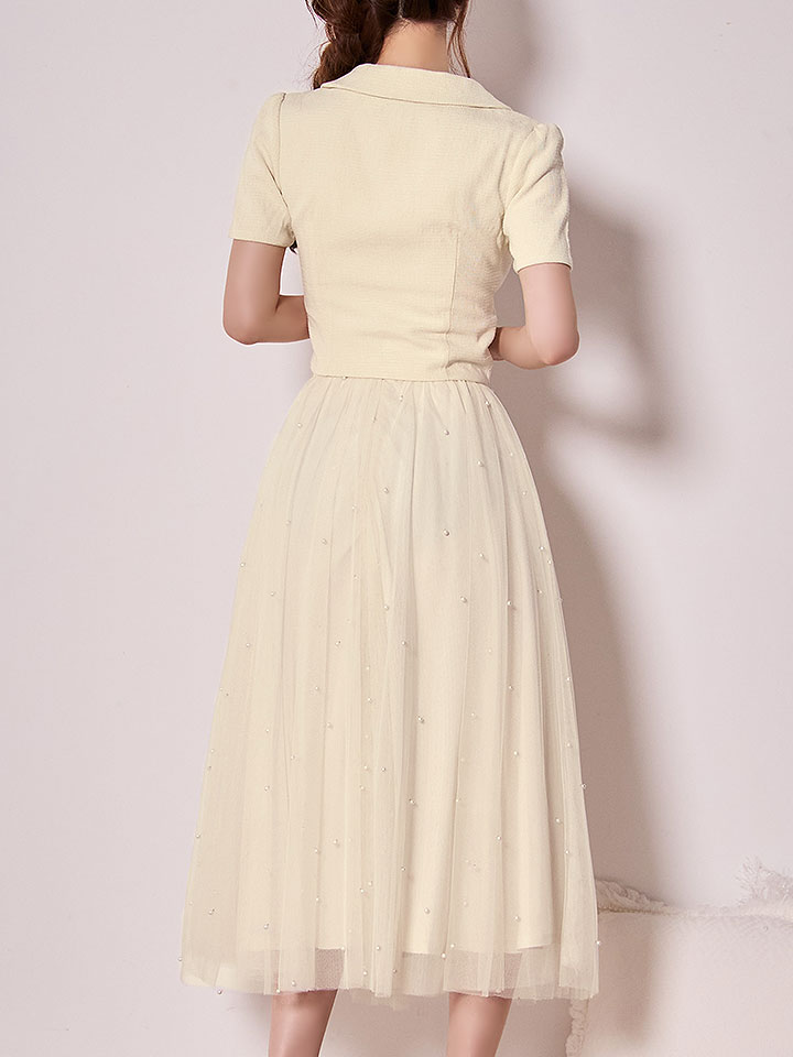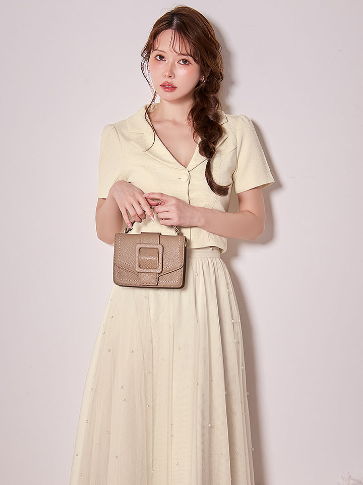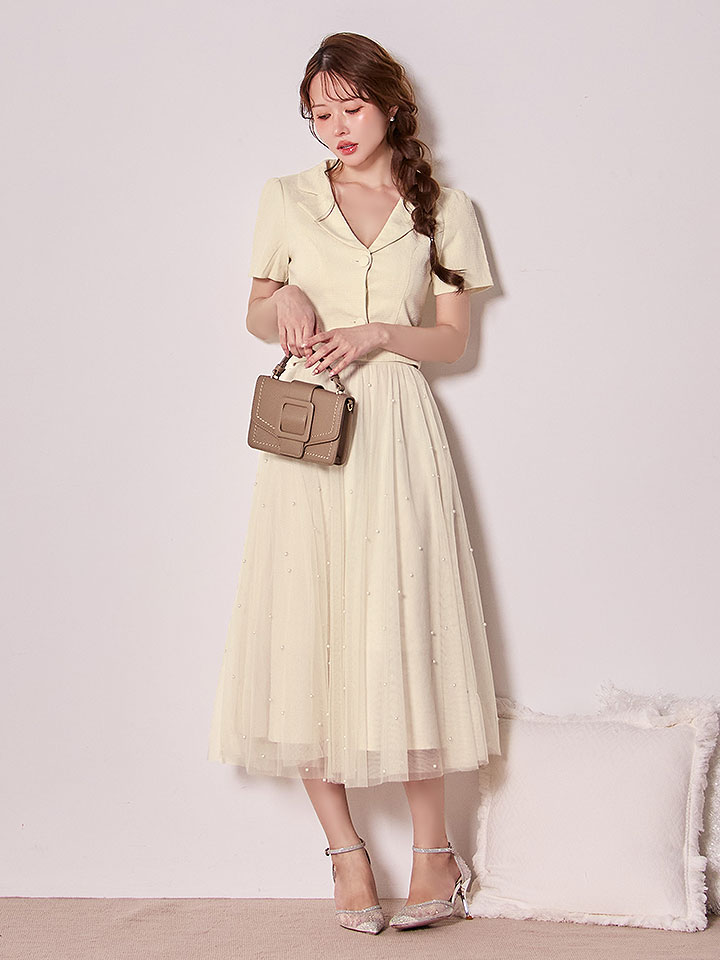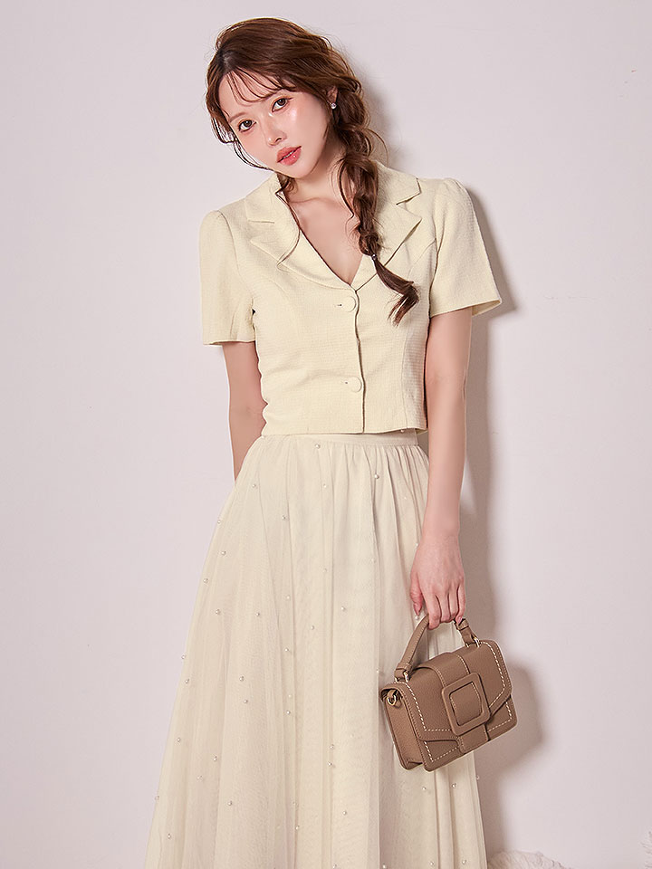 ジャケット×シフォンスカートの大人のスウィートセットアップ