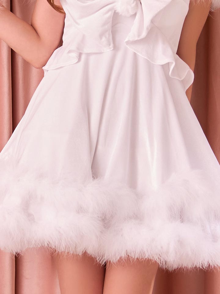 大きなリボンを胸元に、ボリュームのある2段フリルで美脚効果も。