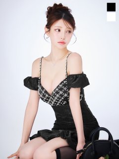 谷間見せは控えめながら、背中にあしらわれたビジューラインがセクシーなアクセントになっています。