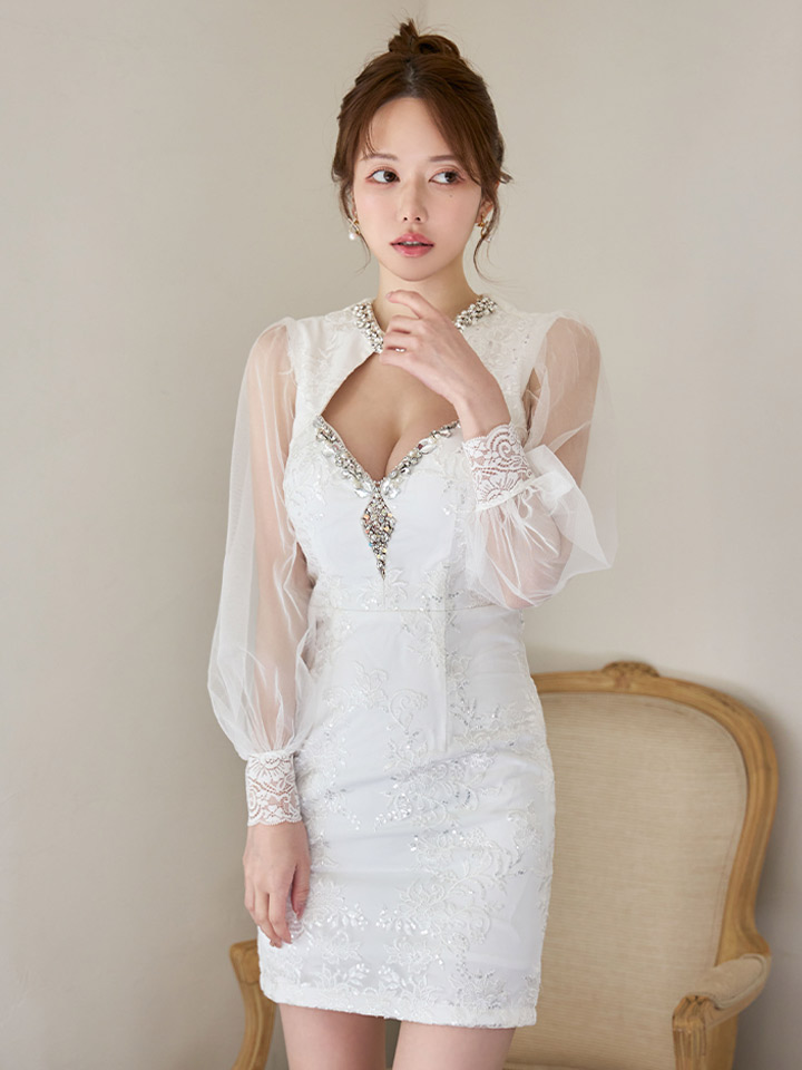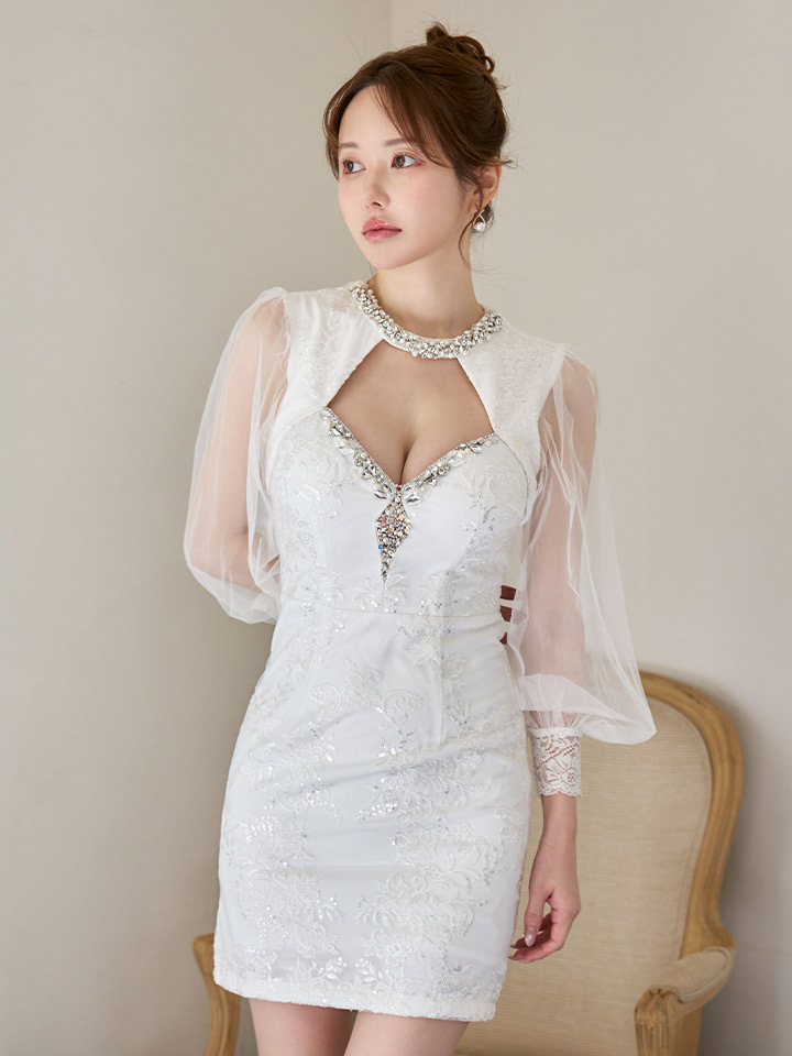 刺繍×ビジューが贅沢で女性らしさ溢れる大人可愛いミニワンピドレス。