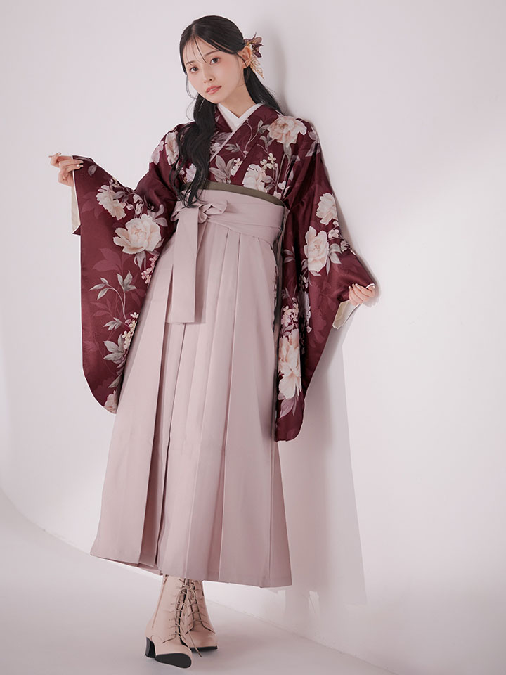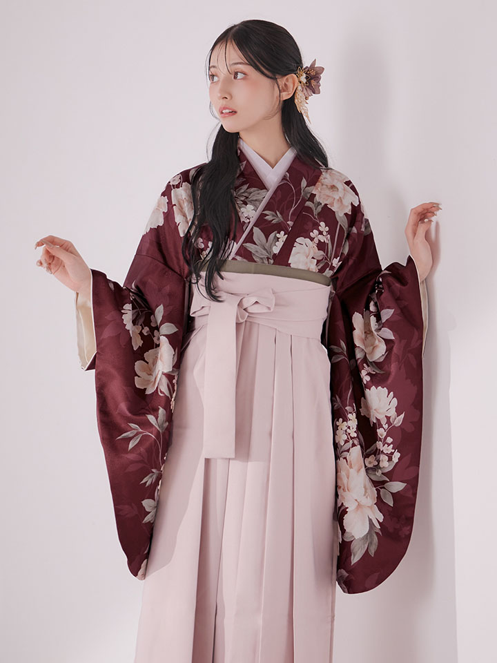 【予約商品/1月中旬発送予定】ピンク芍薬 ワインレッド二尺袖着物【卒業袴3点セット 二尺袖着物/帯/袴】 [HR-108-ok-WR-F-25MU-251220]